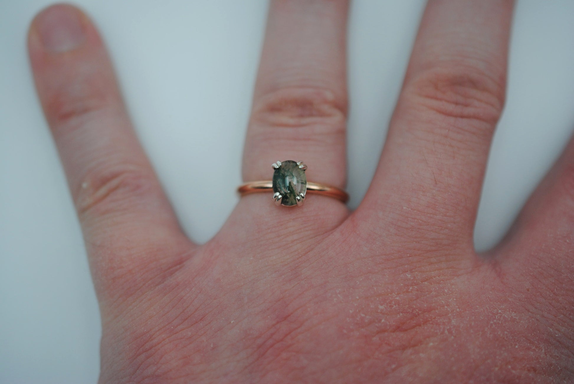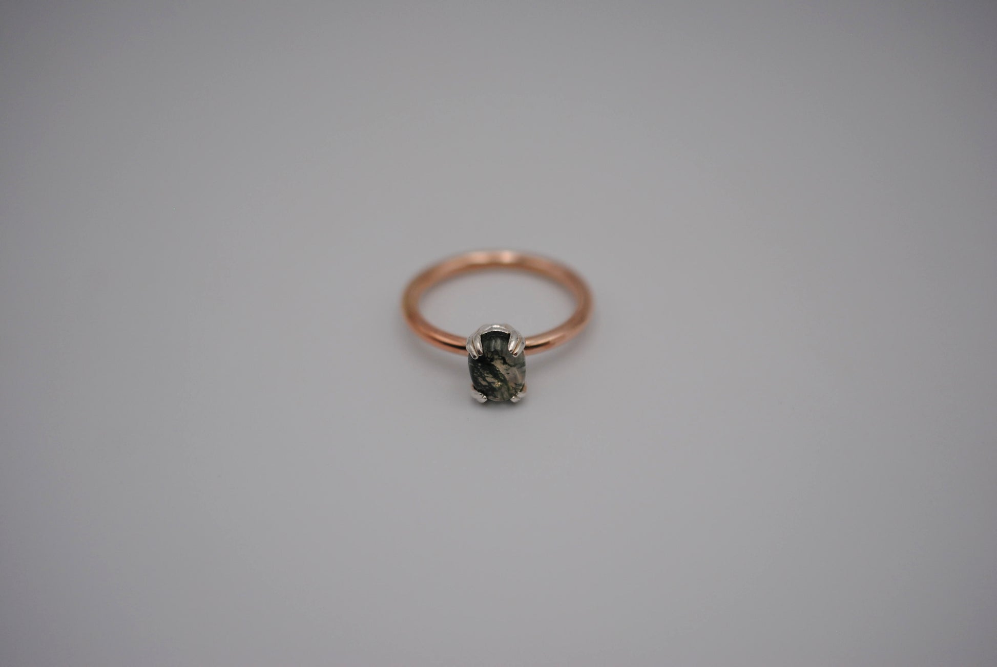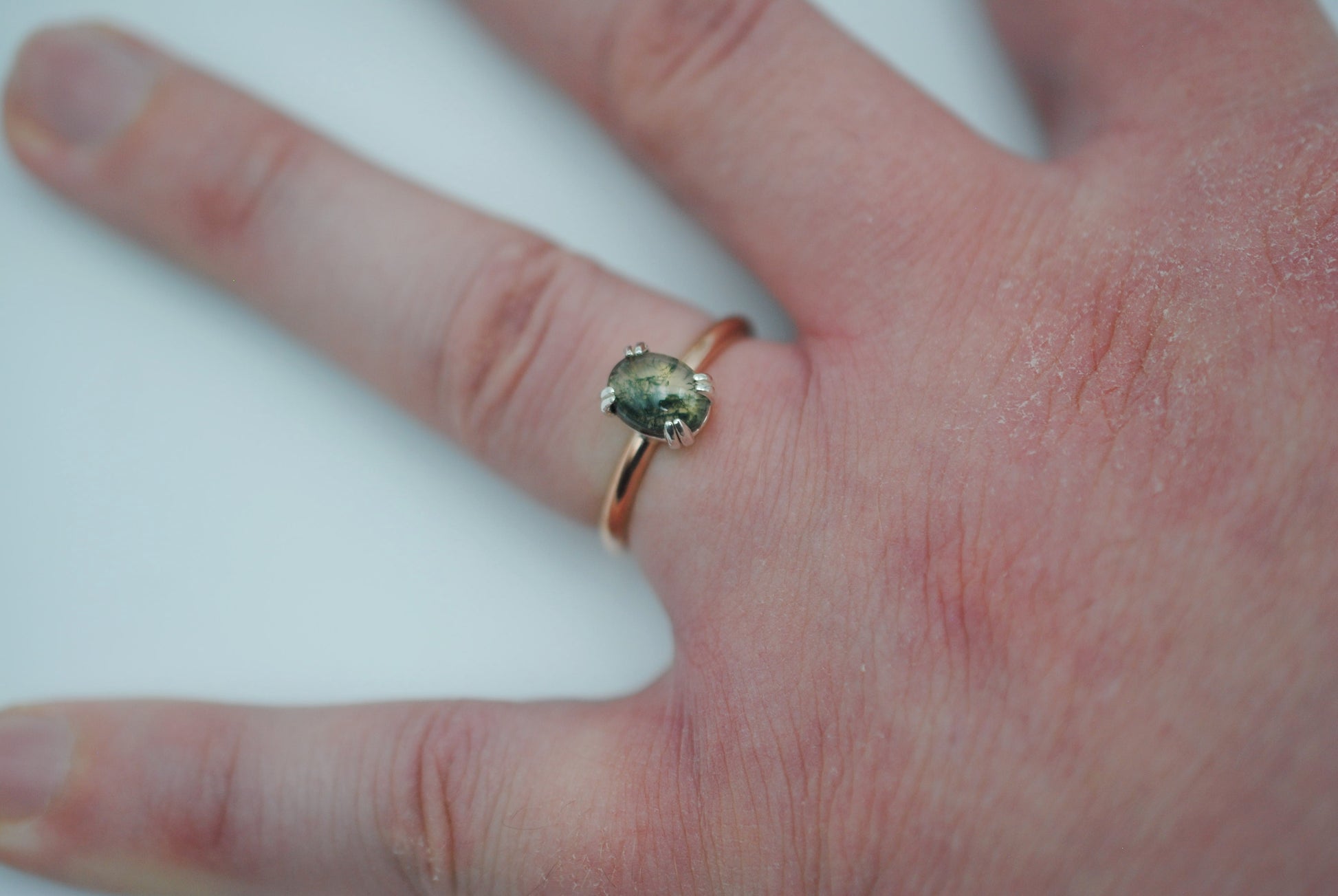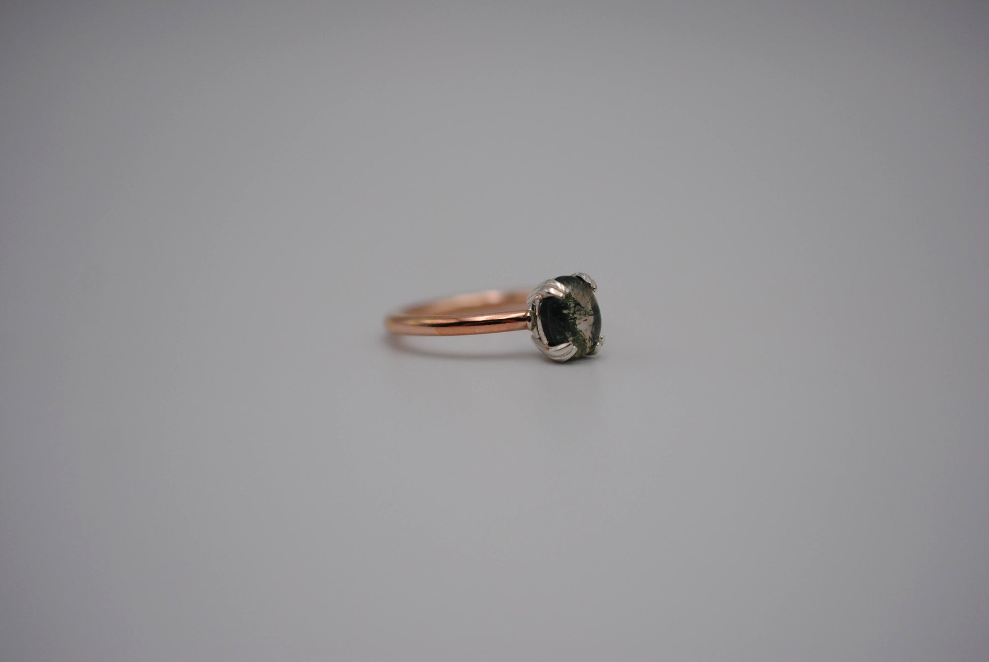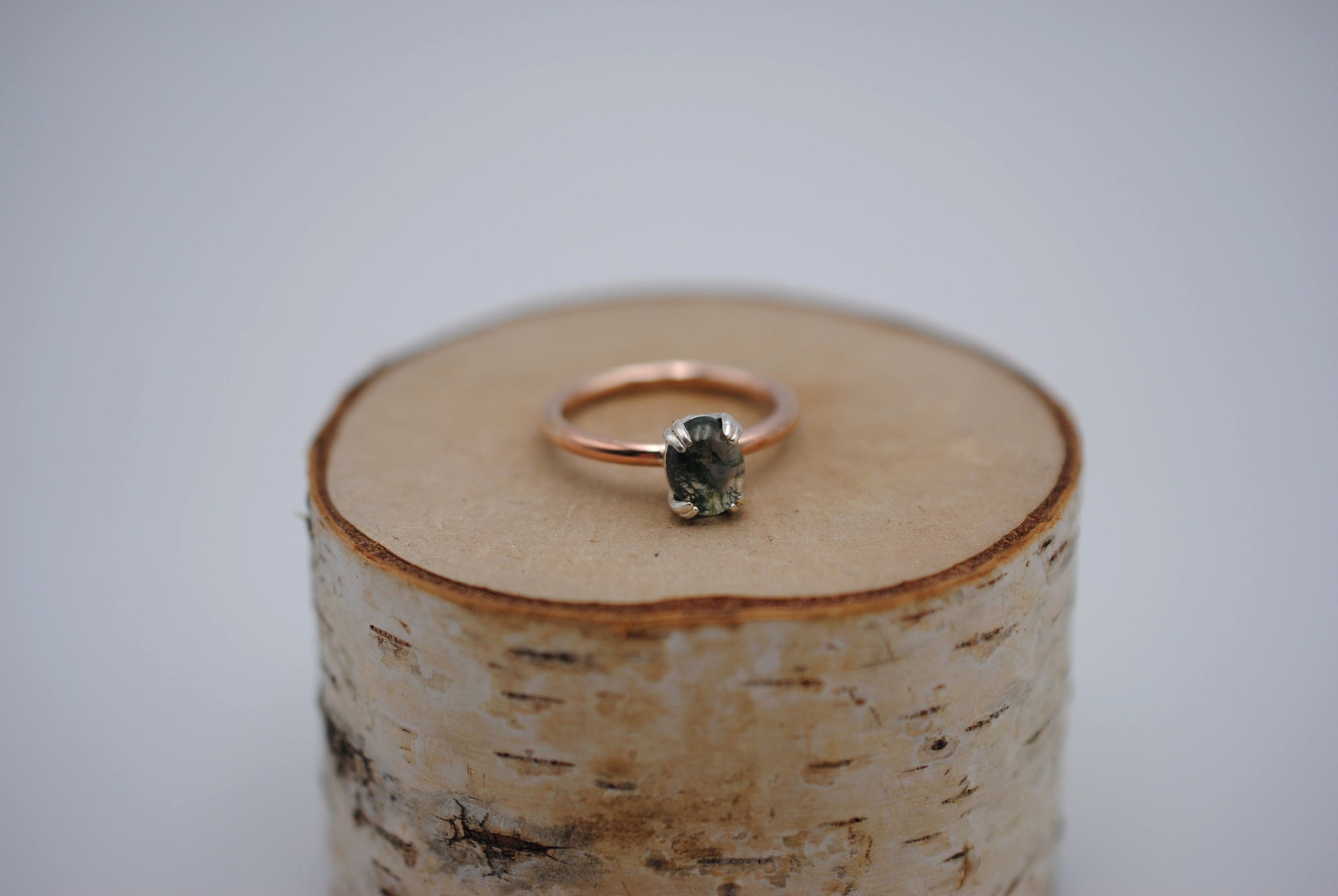 This is our Moss Agate Ring: Oval Cut, Rose Gold Fill Band, Silver Double Prong Setting.