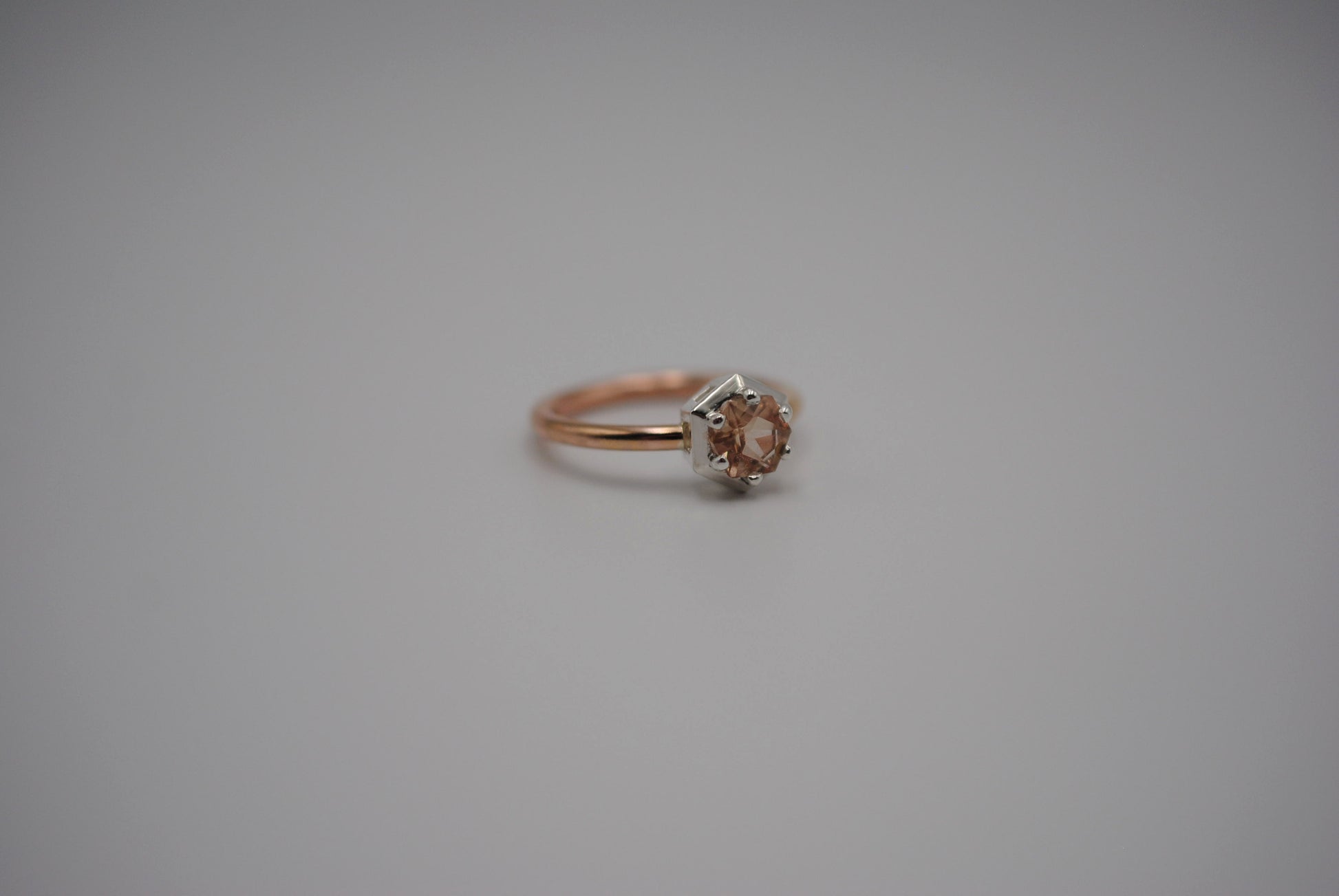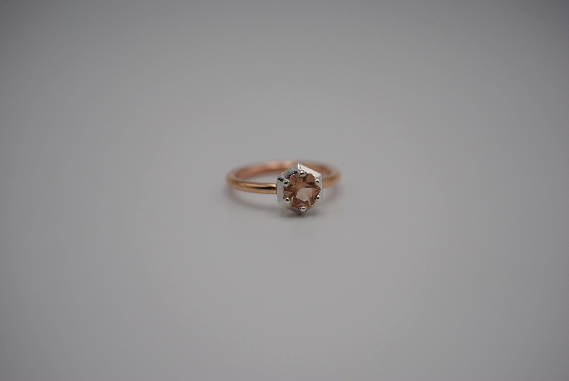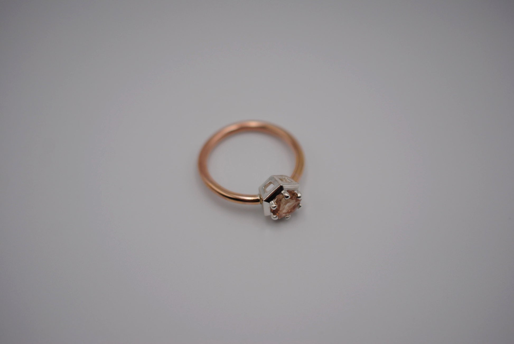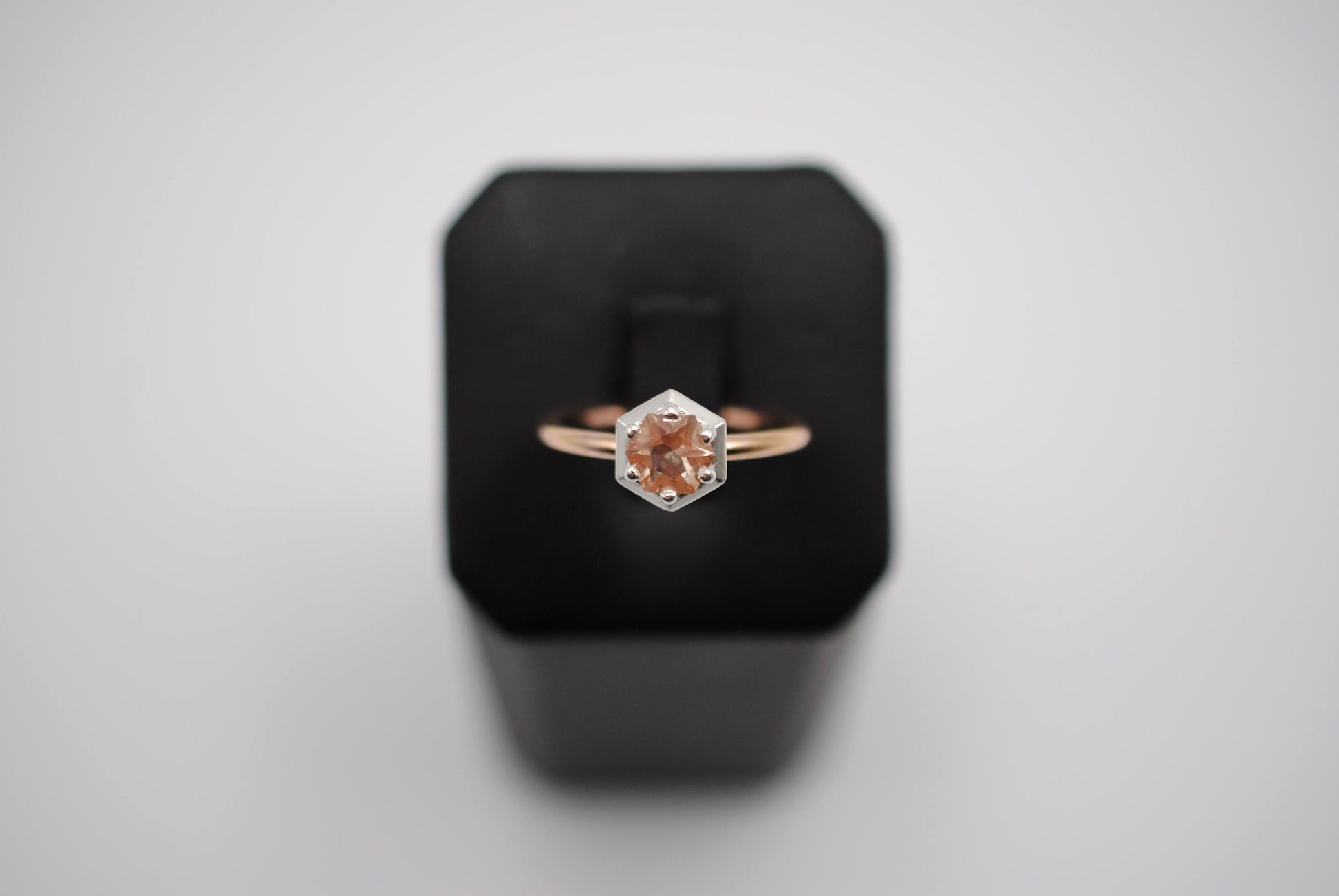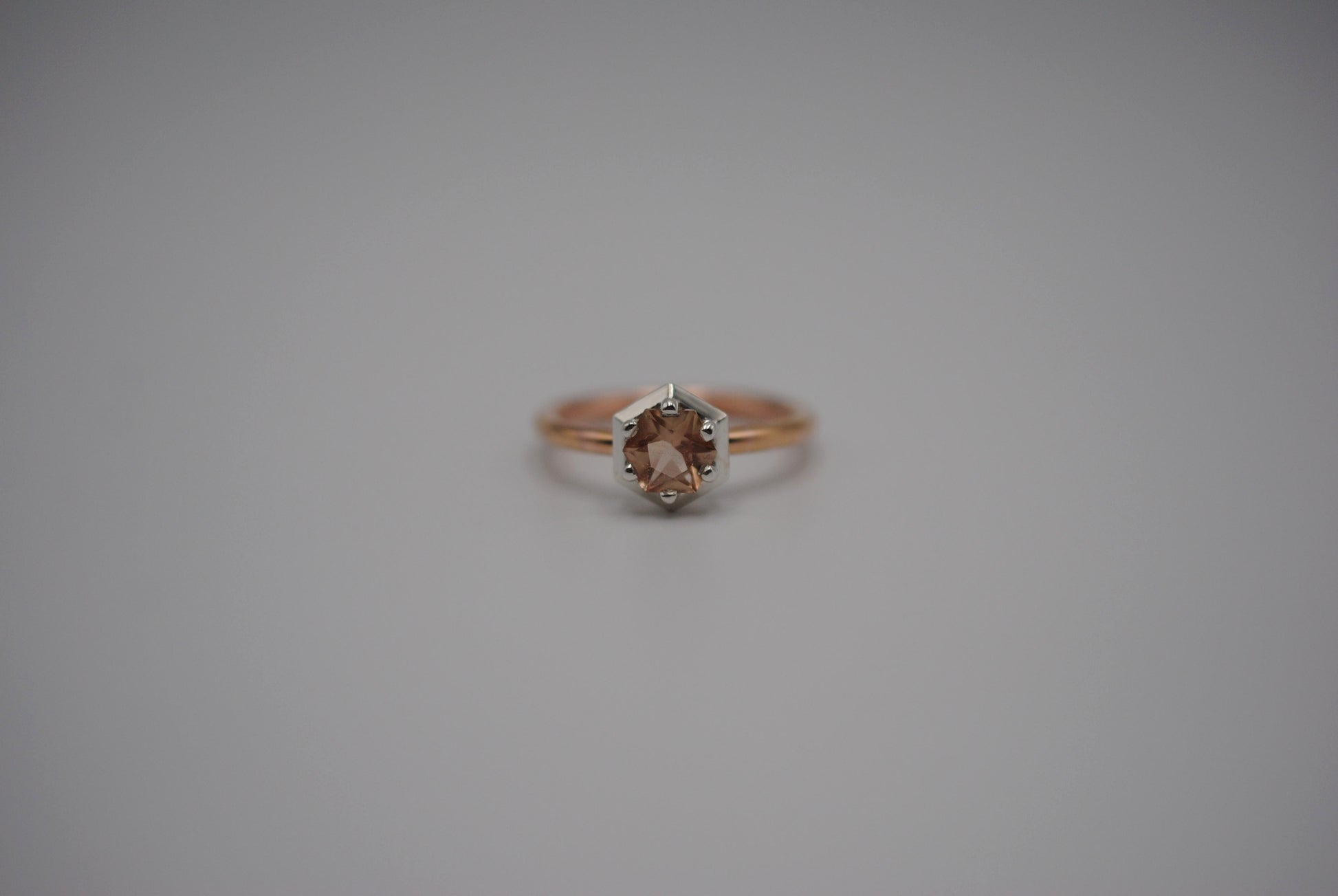 This is our Oregon Sunstone Ring : Hexagon Cut, Rose Gold Fill Band, Silver Prong Setting.