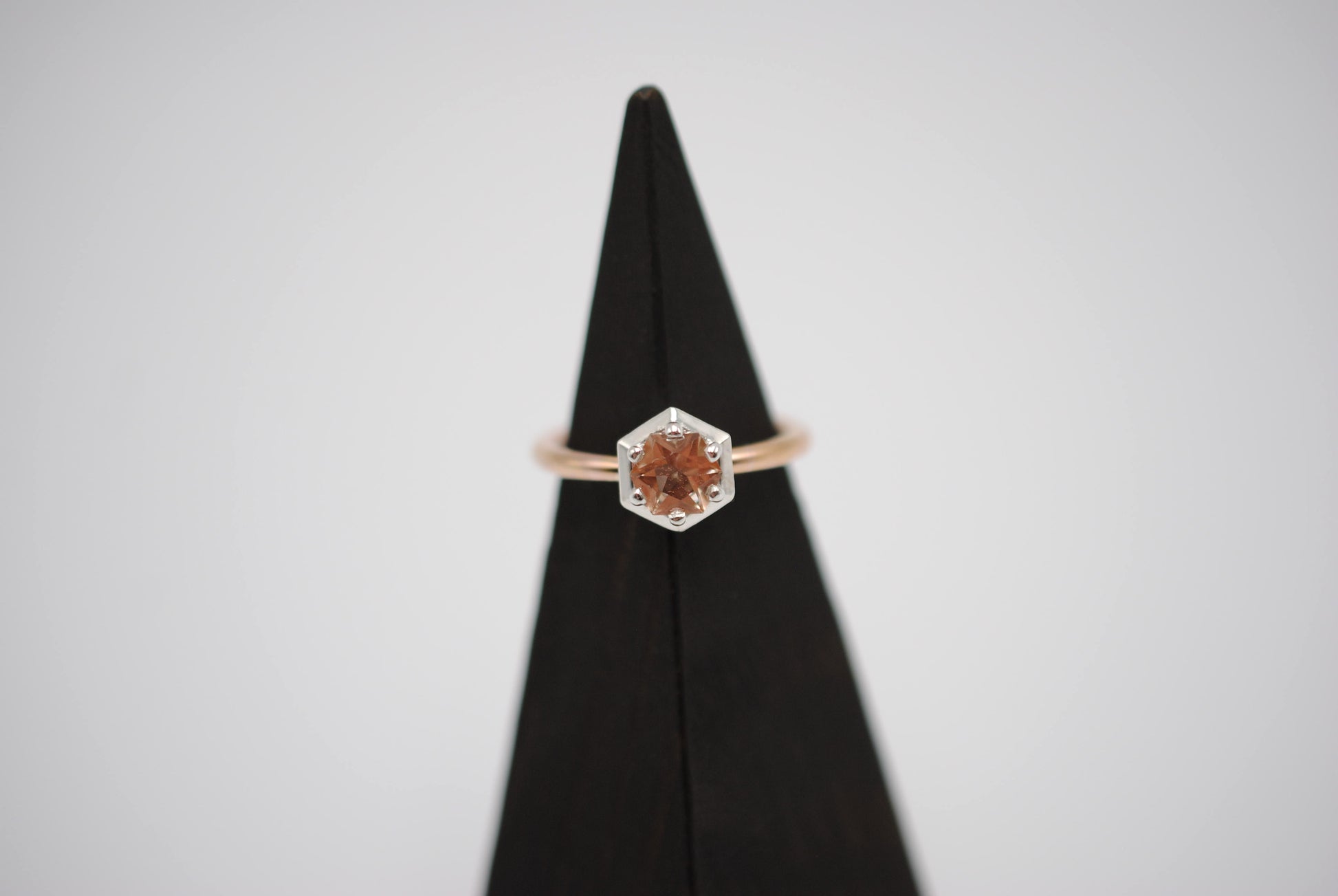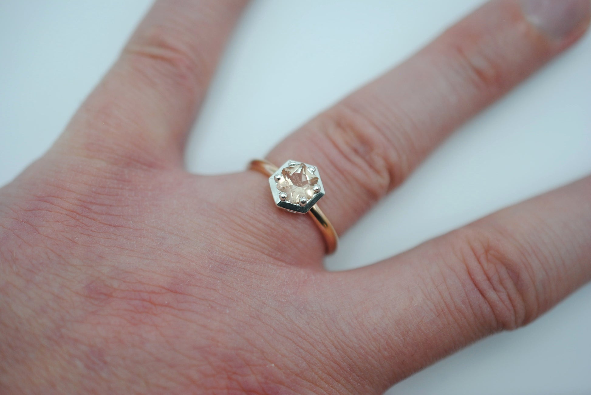 The ring features an ethically sourced natural Oregon sunstone. It's hexagon cut and 6mm.