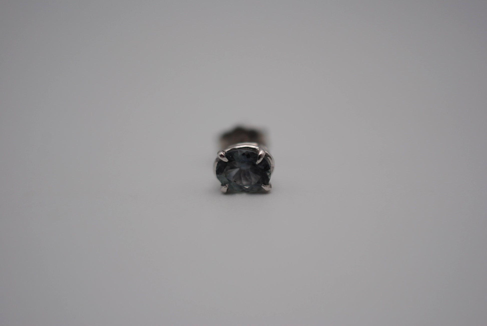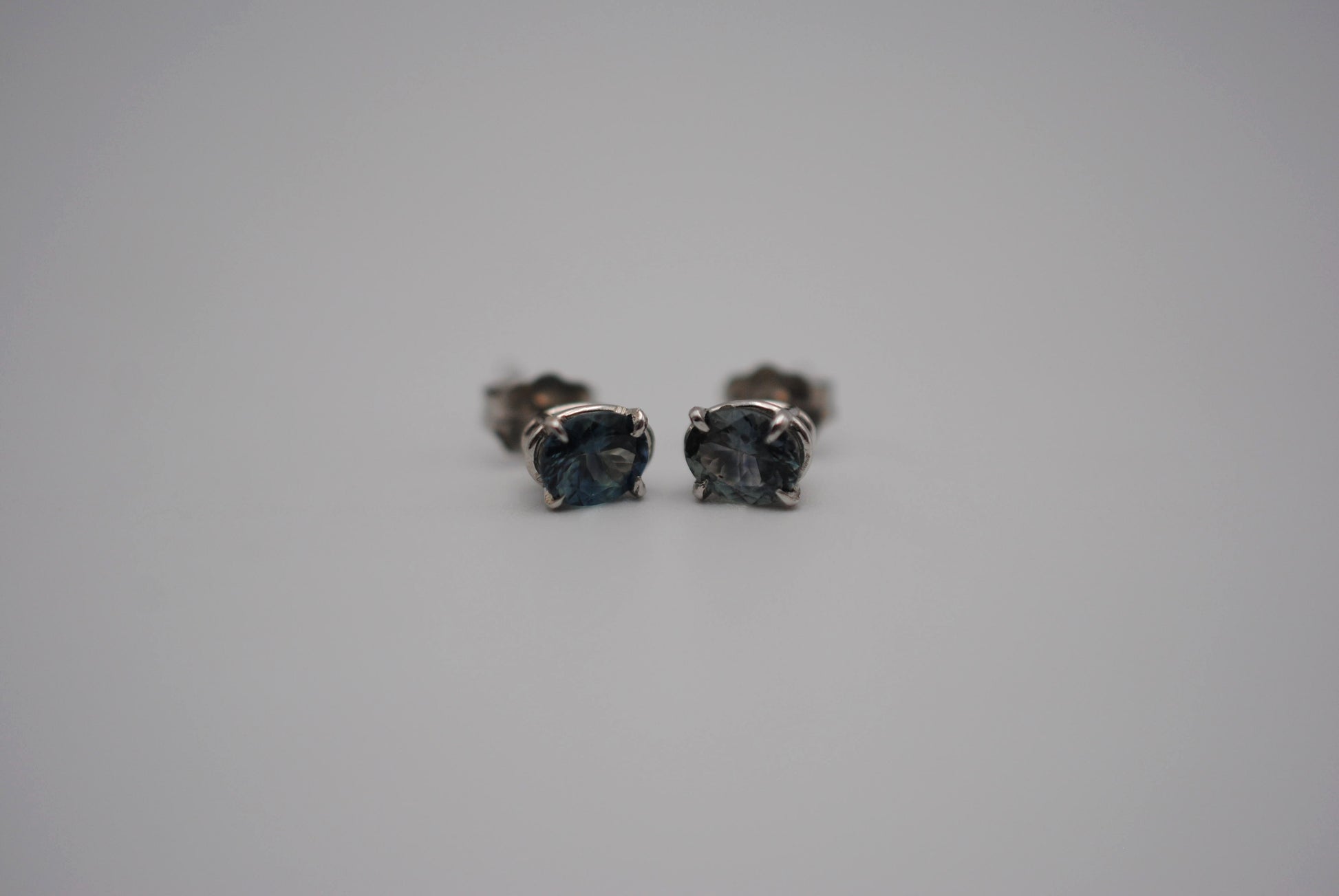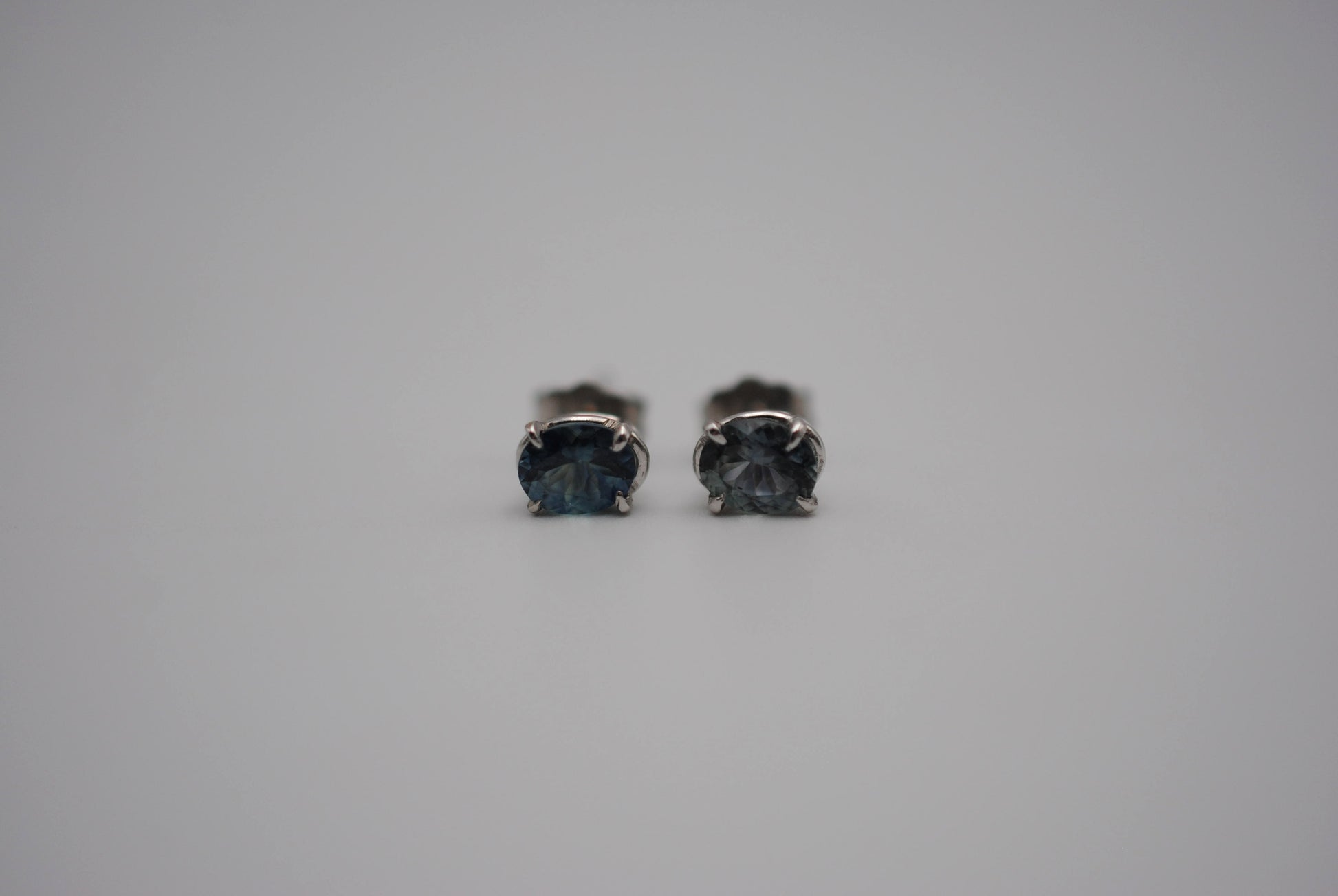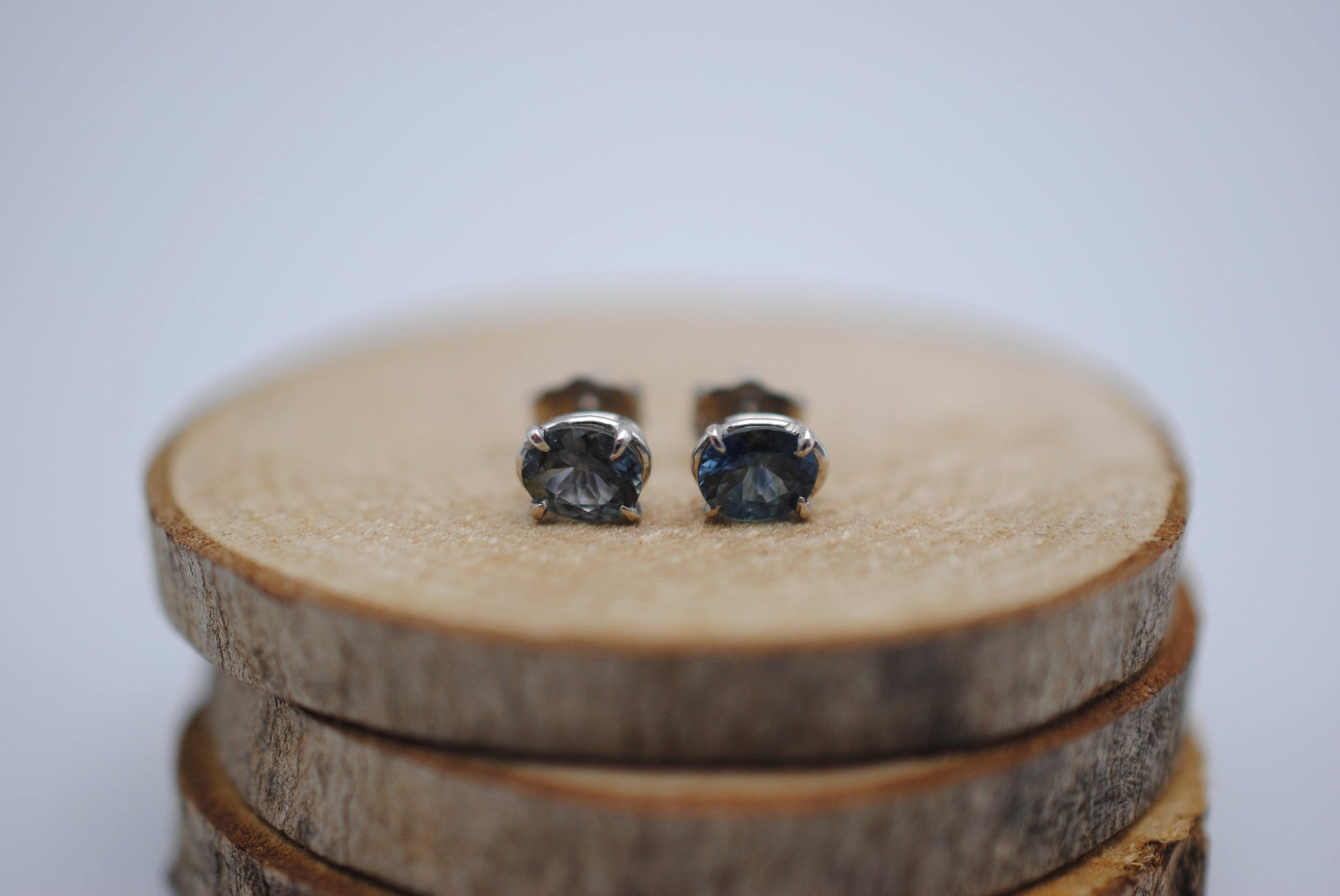 They feature an ethically sourced natural 5mm by 4mm Montana Sapphire. They're in a prong setting.