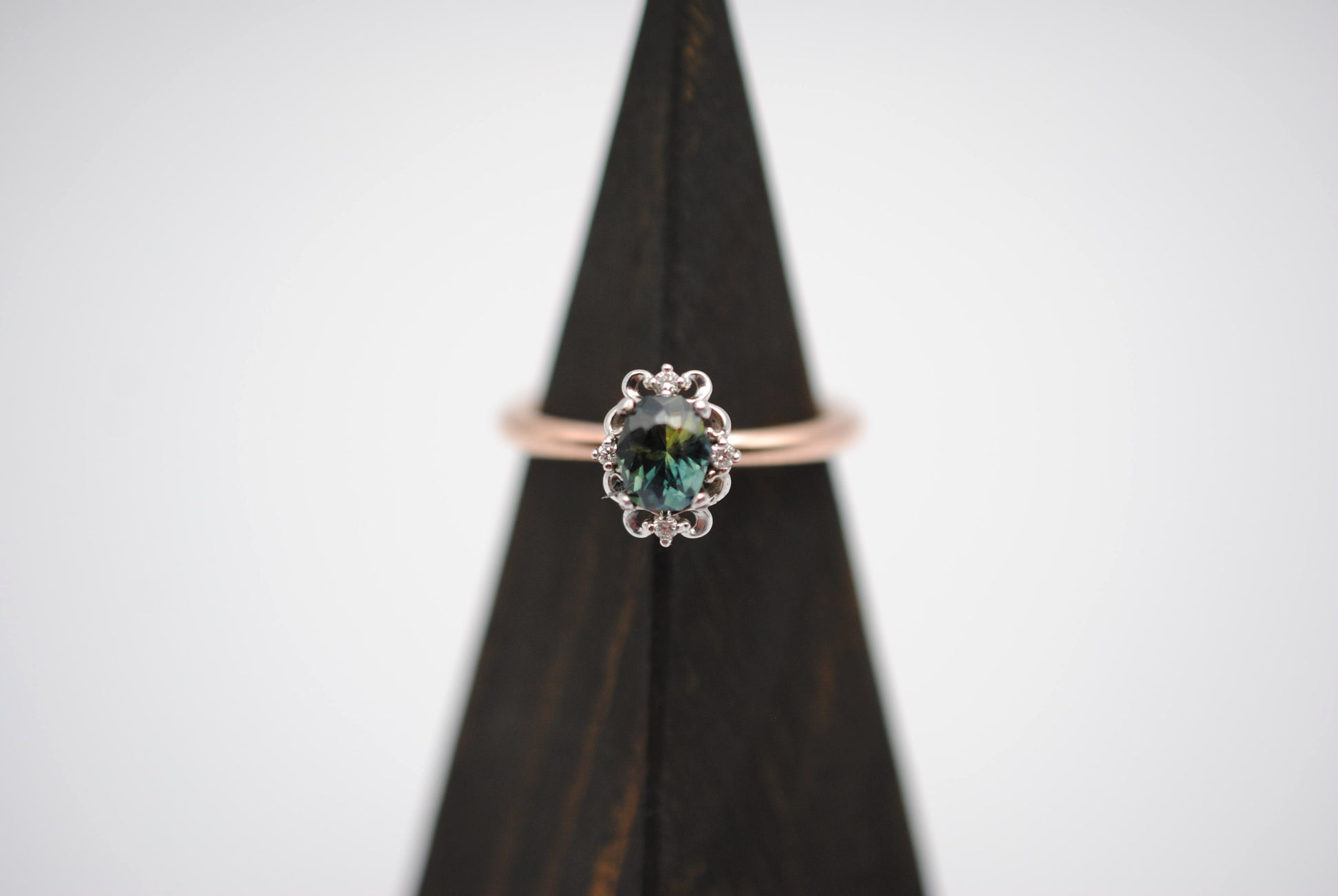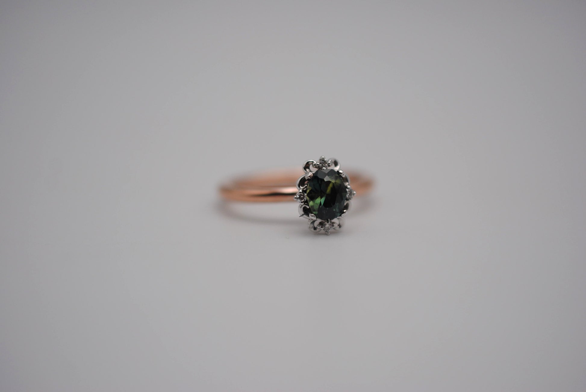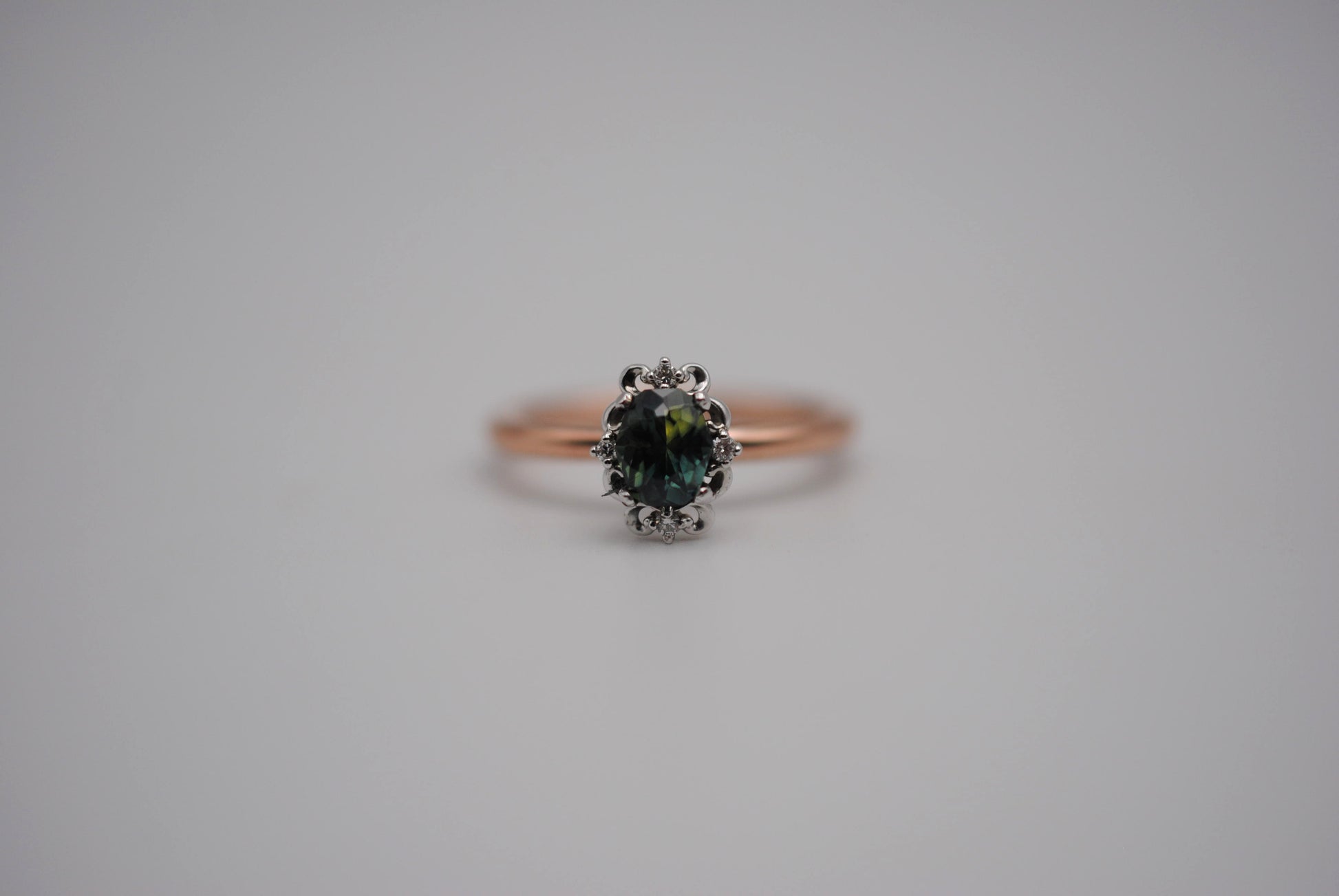 This is our Oval Nigerian Sapphire on Rose Gold Band in Vintage Diamond White Gold Setting Ring.