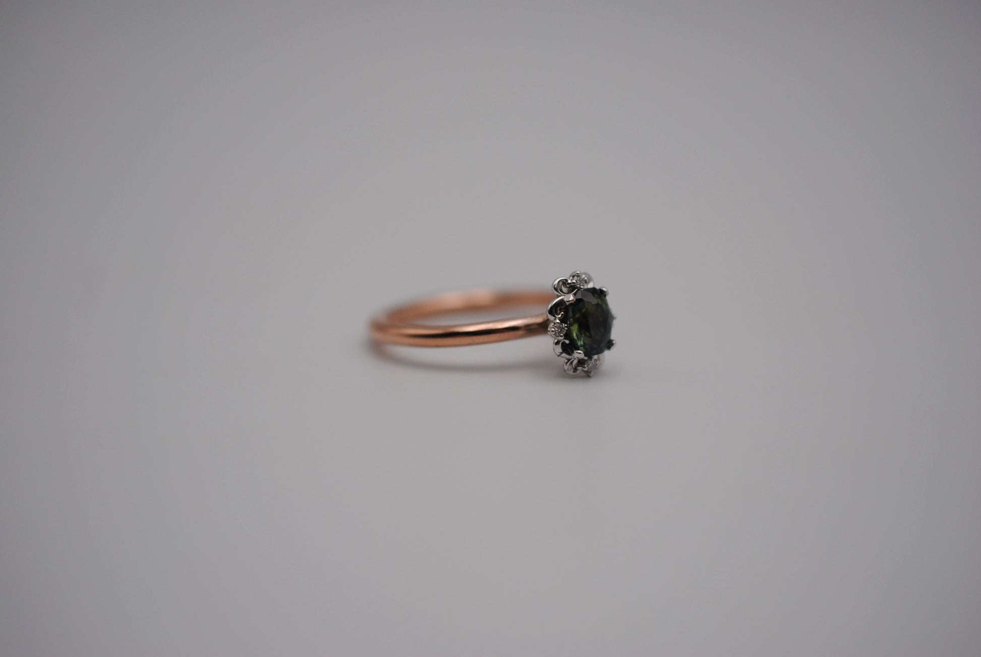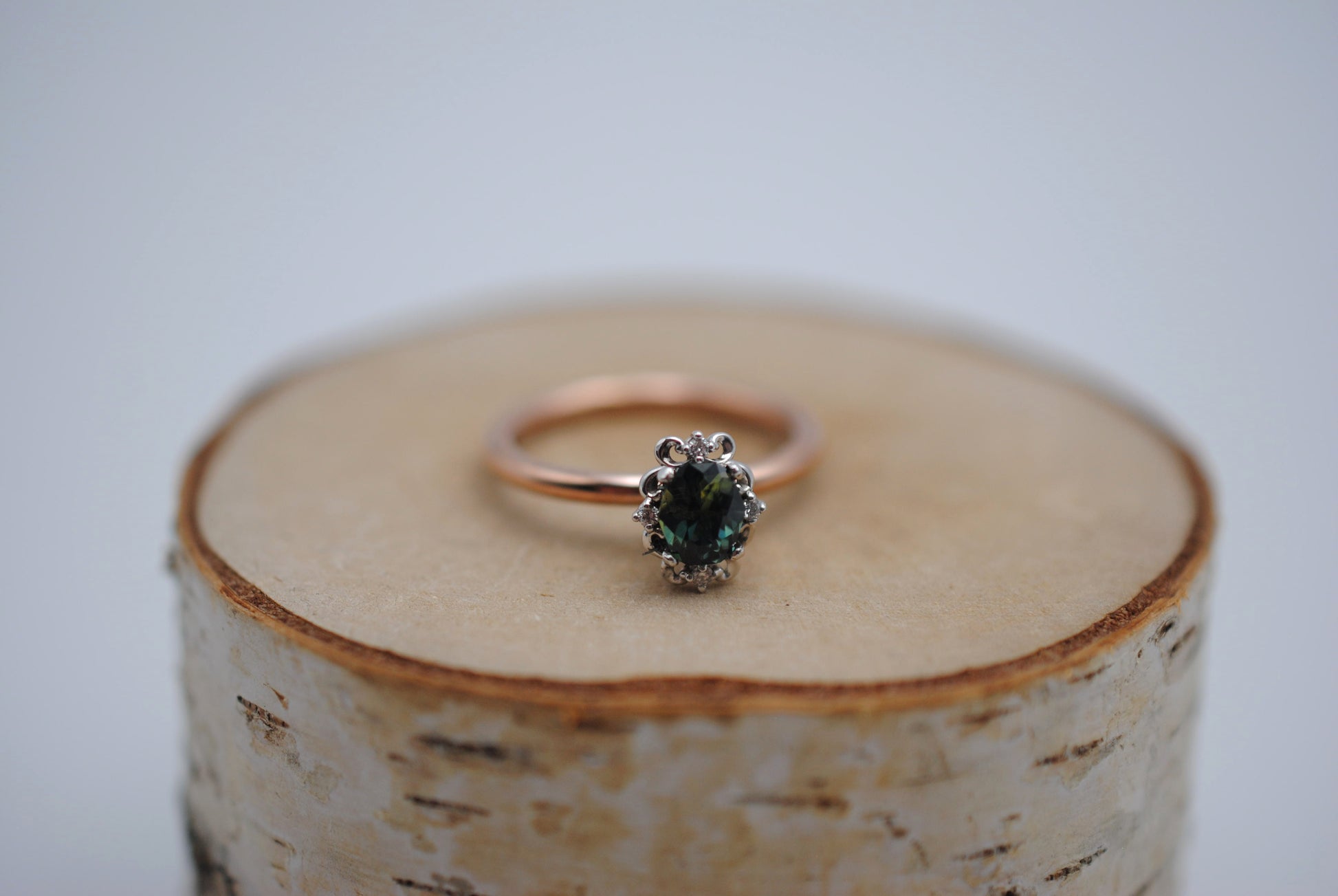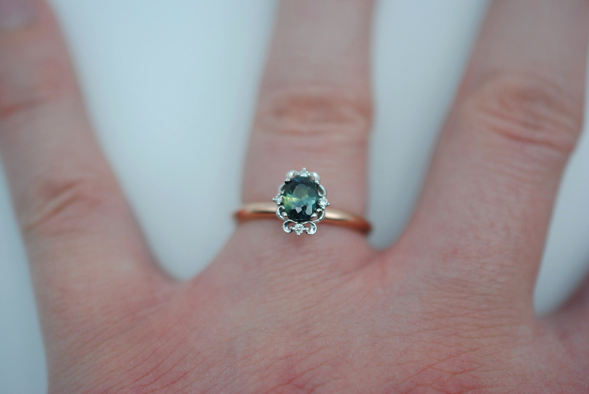 This is our Oval Nigerian Sapphire on Rose Gold Band in Vintage Diamond White Gold Setting Ring.