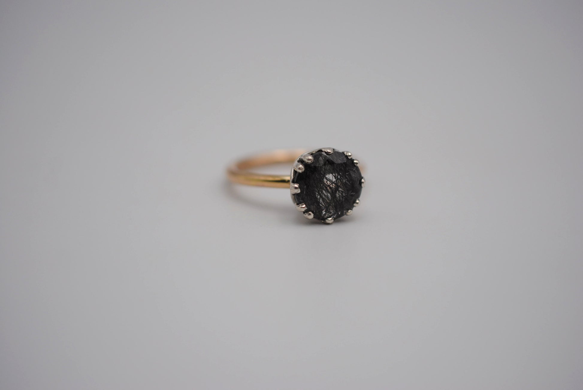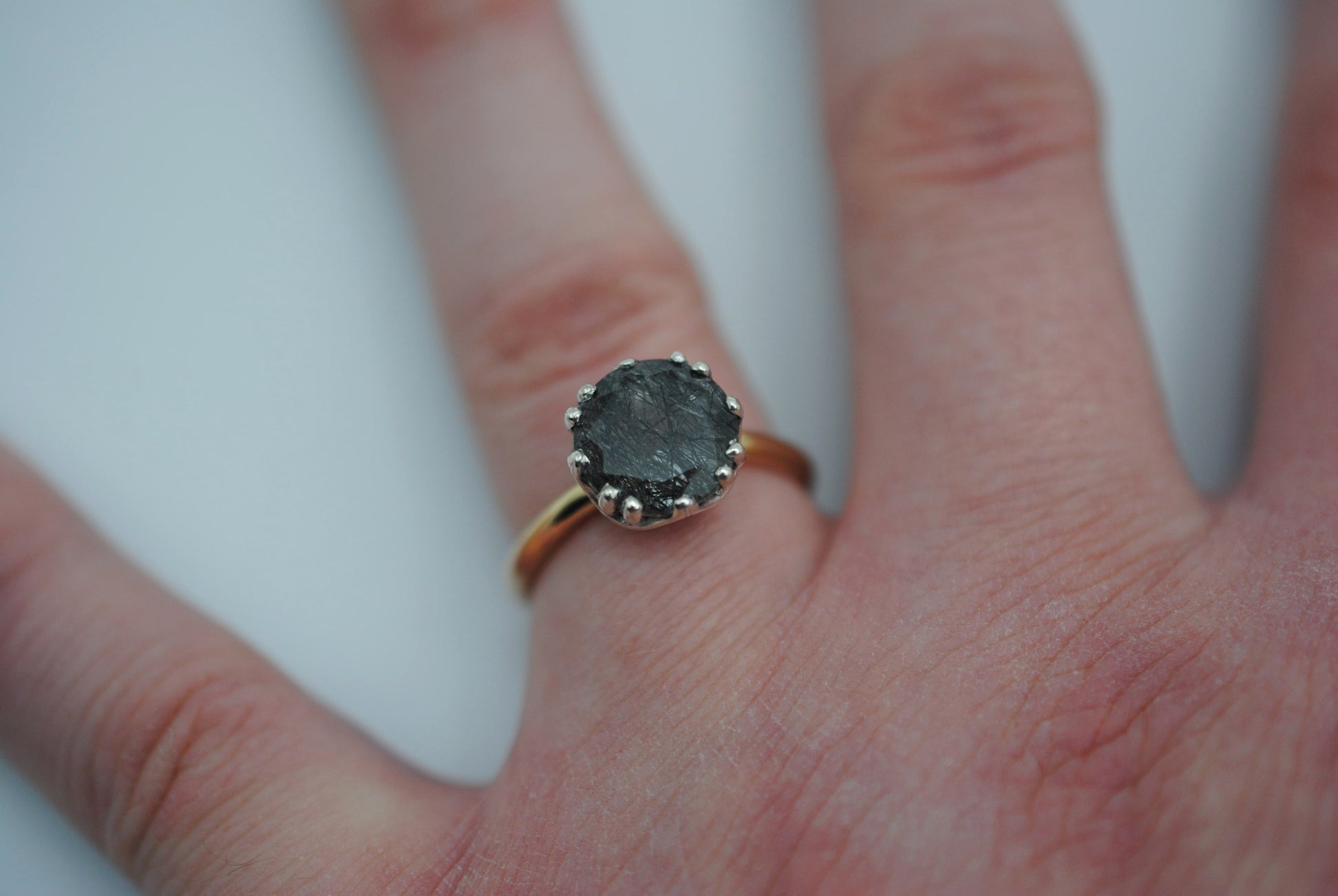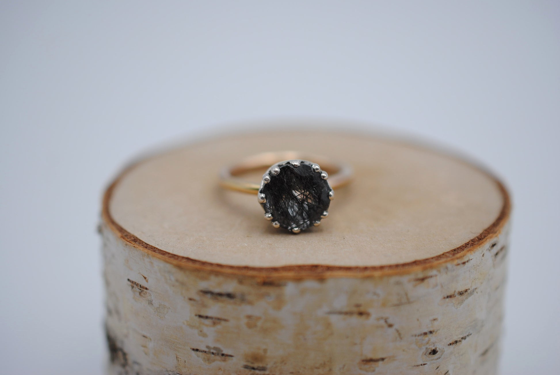 This ring features a 10mm round rutilated quartz. This stone has tourmaline inclusions. The melding of these two minerals makes for a beautiful organic one of a kind look. These gemstones exemplify wabi sabi, our trademark aesthetic. It's in a silver 12 prong setting.