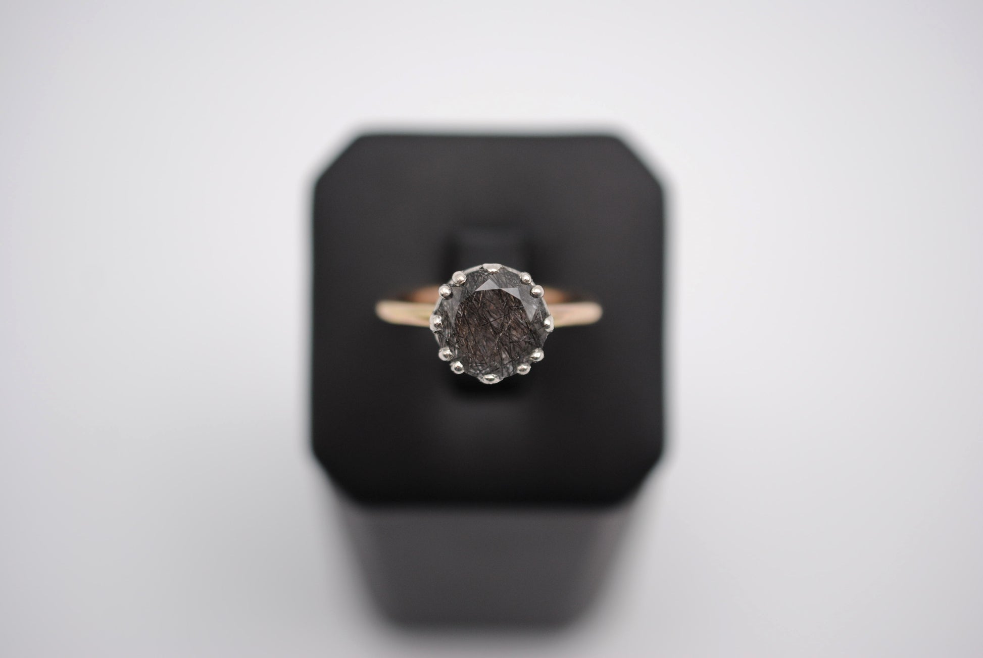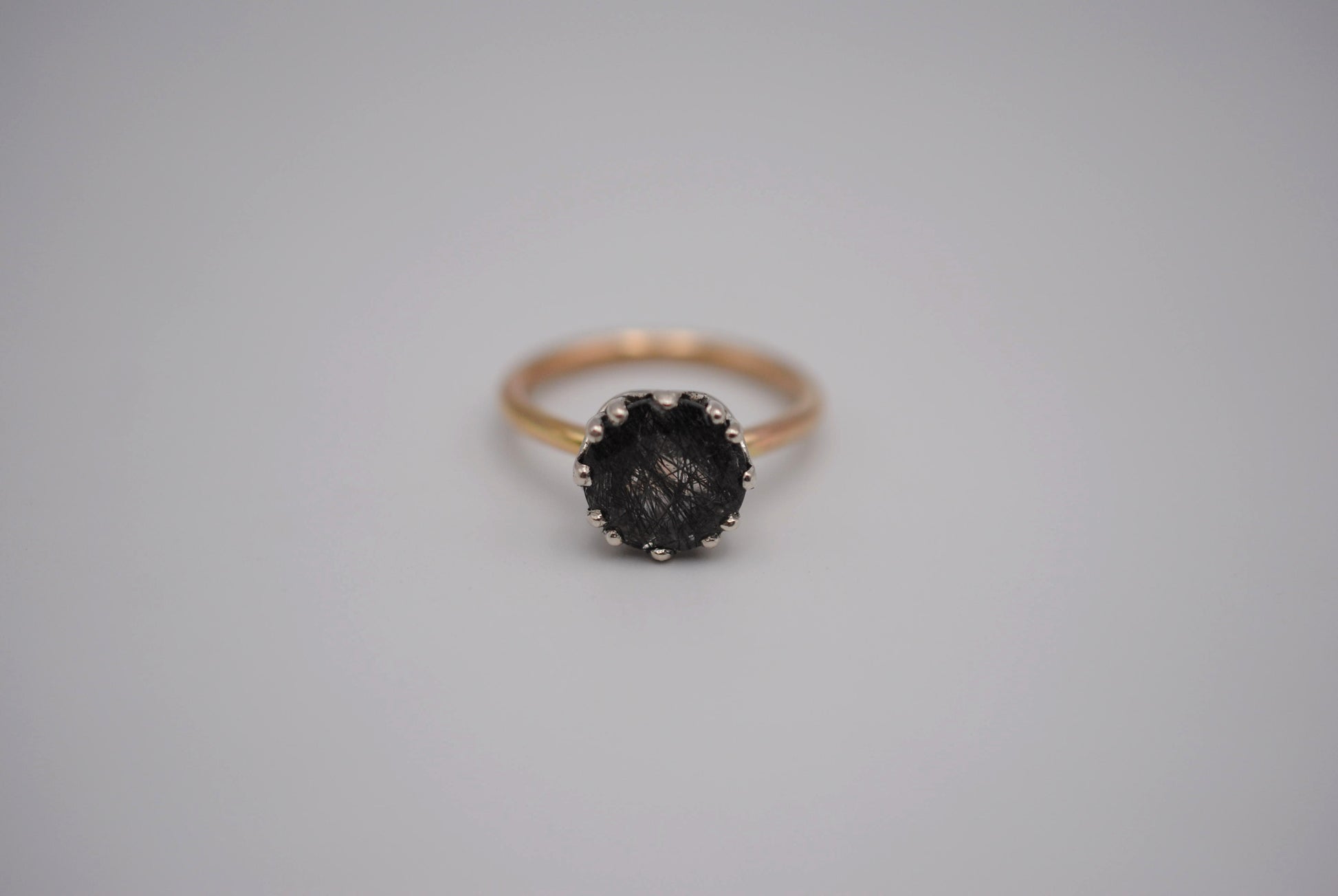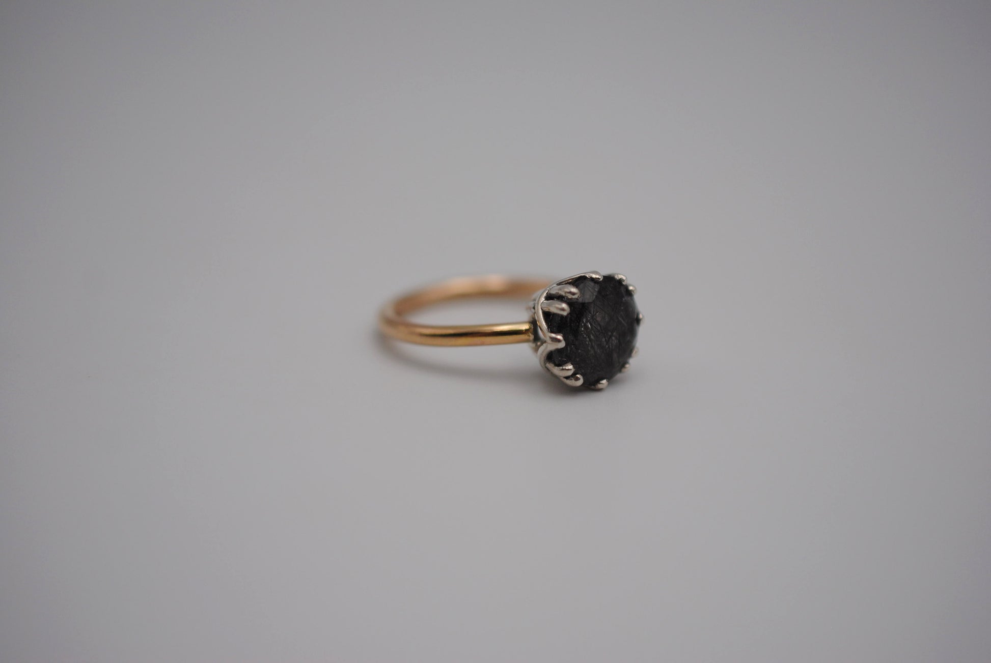 This ring features a 10mm round rutilated quartz. This stone has tourmaline inclusions. The melding of these two minerals makes for a beautiful organic one of a kind look. These gemstones exemplify wabi sabi, our trademark aesthetic. It's in a silver 12 prong setting.