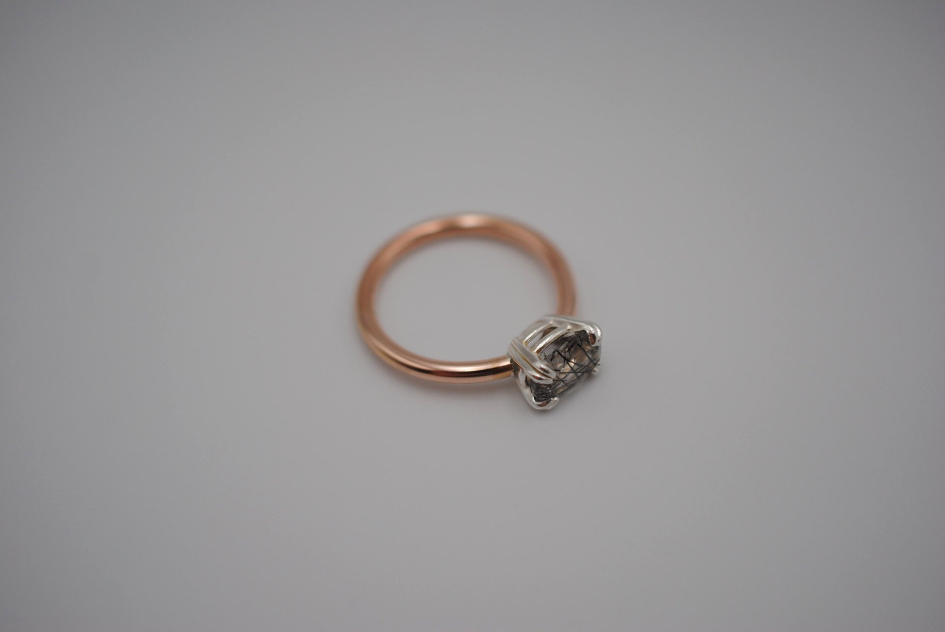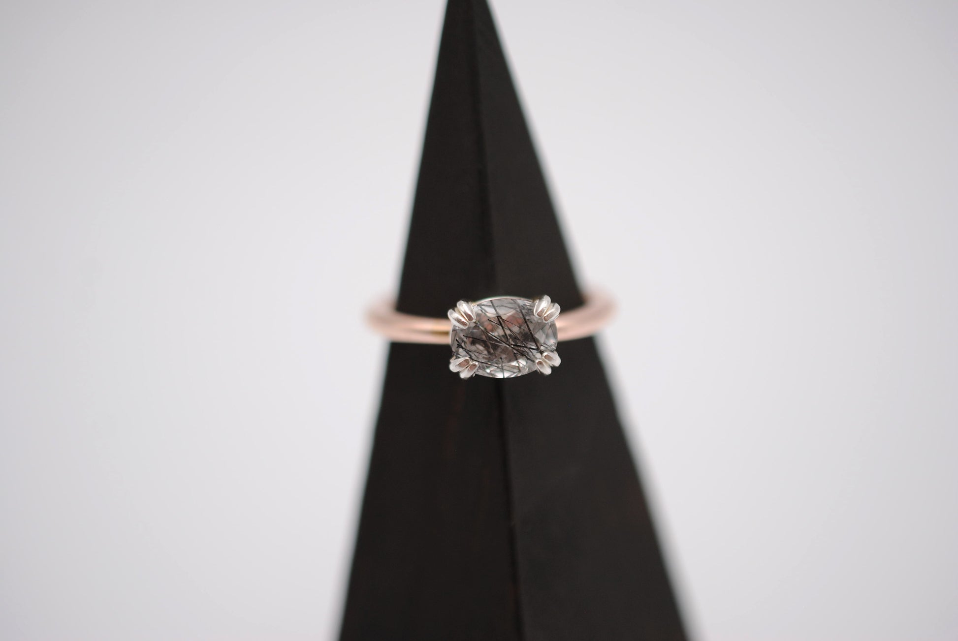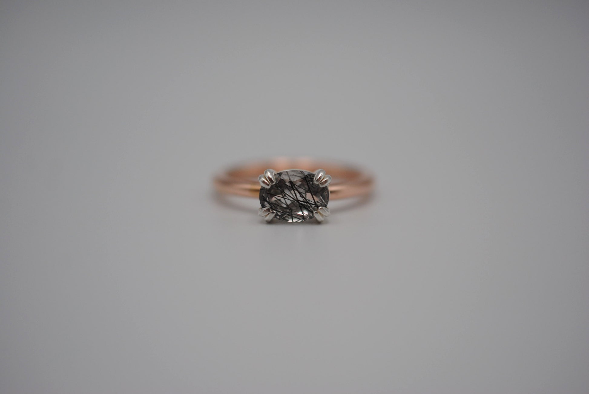 The ring features an 8 x 6mm oval cut rutilated quartz. This type of quartz has tourmaline inclusions. The quartz is natural and ethically sourced.