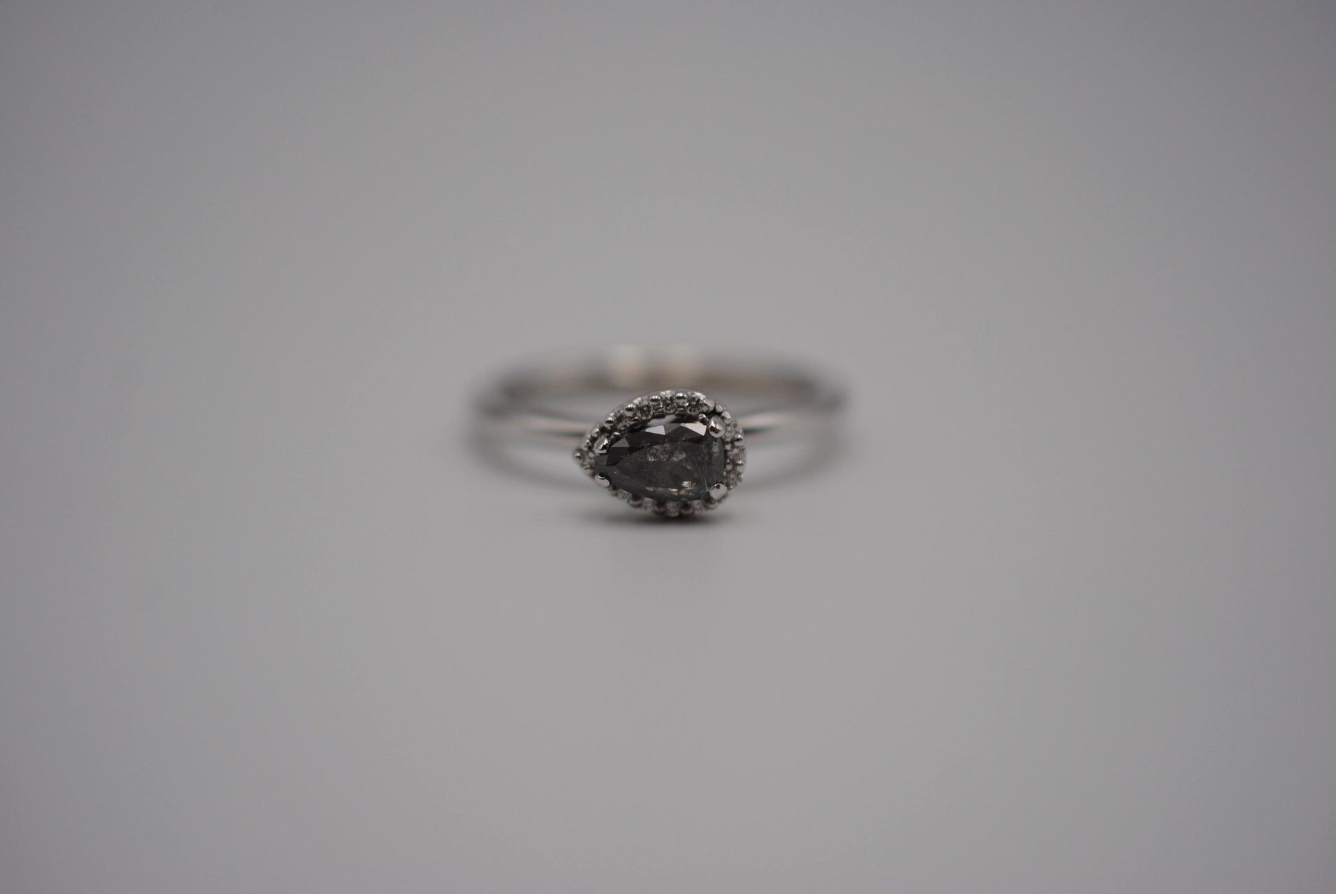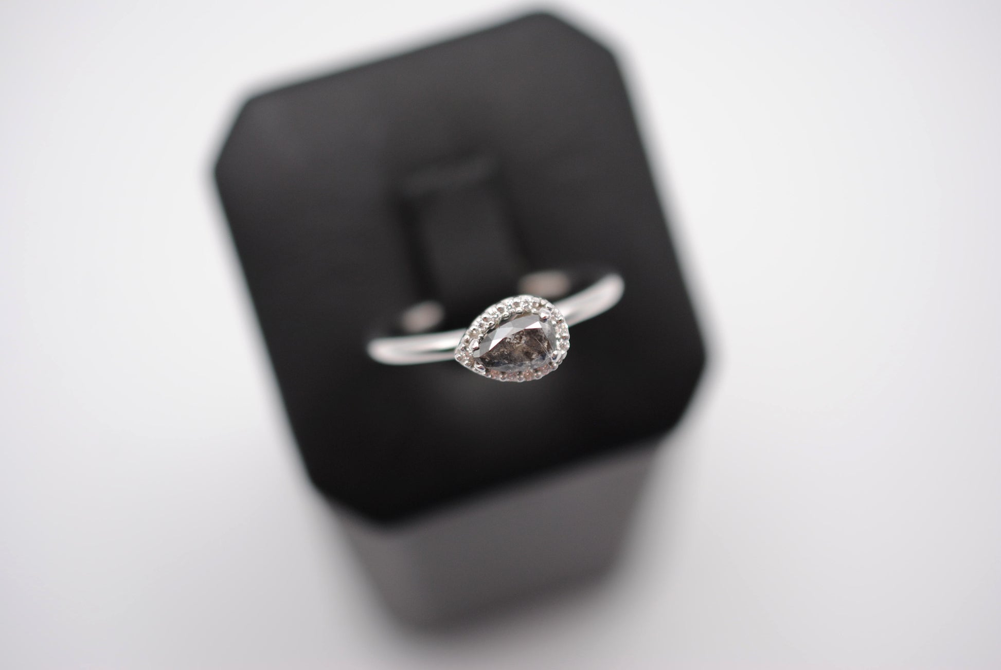 This is our Salt and Pepper Ring: Pear Cut, Diamond Halo, White Gold.