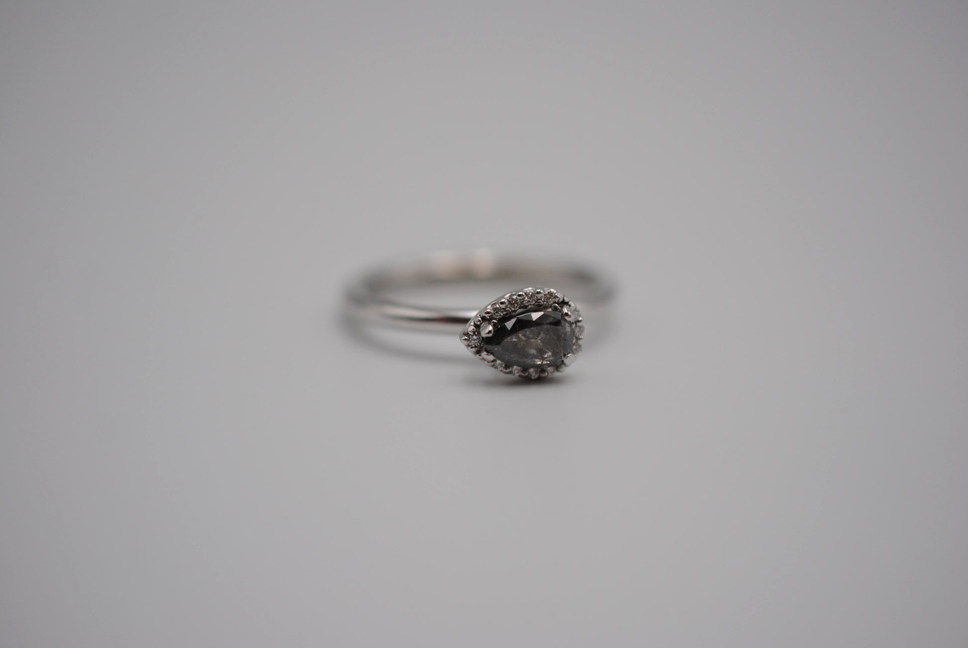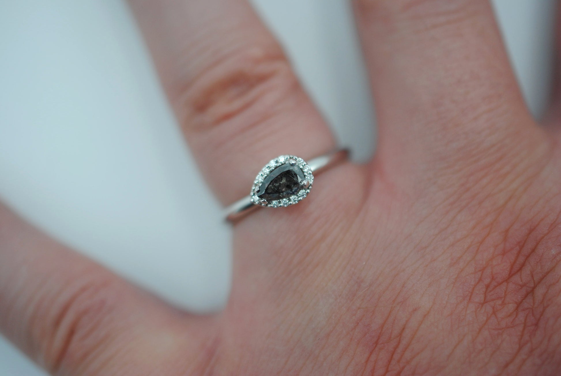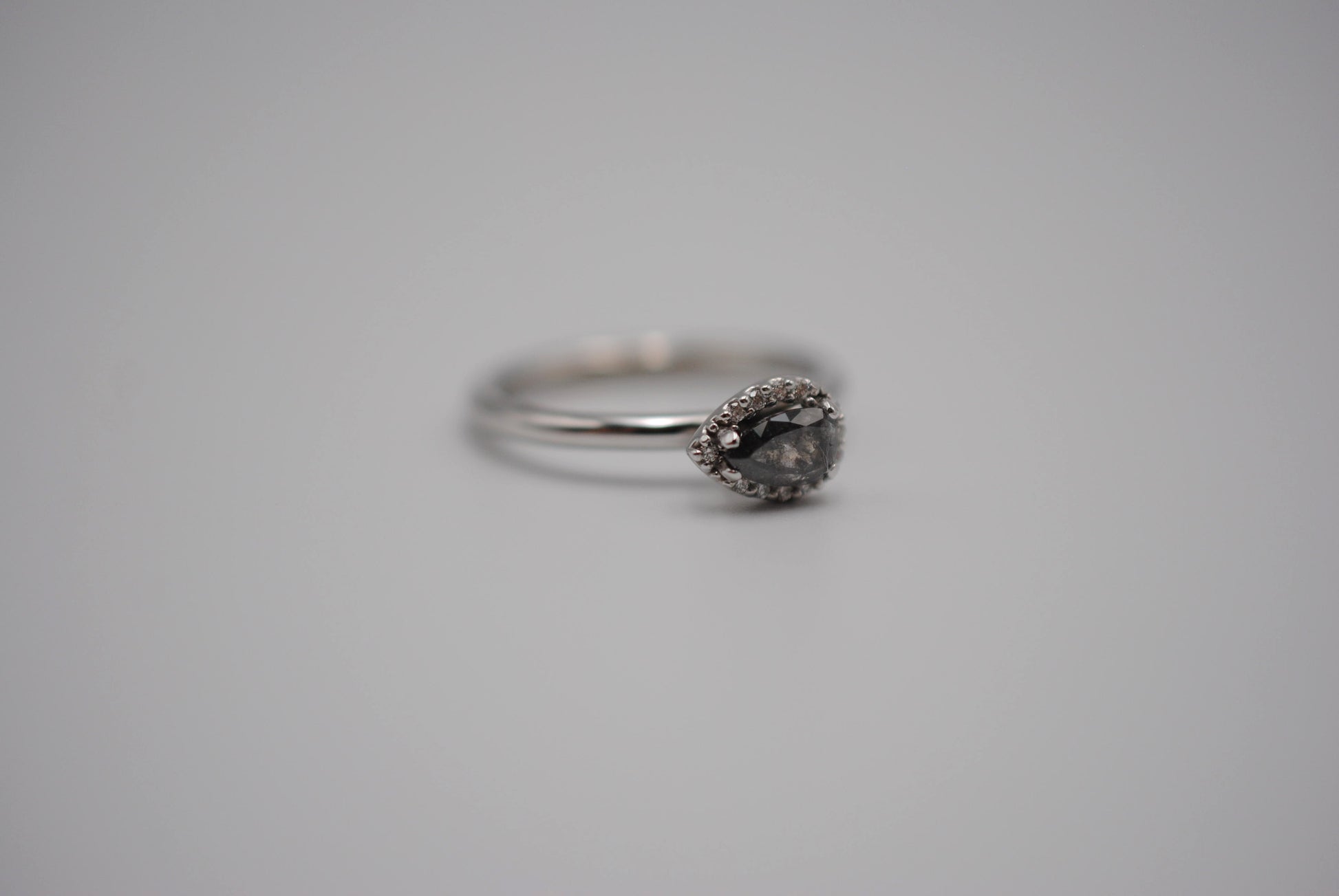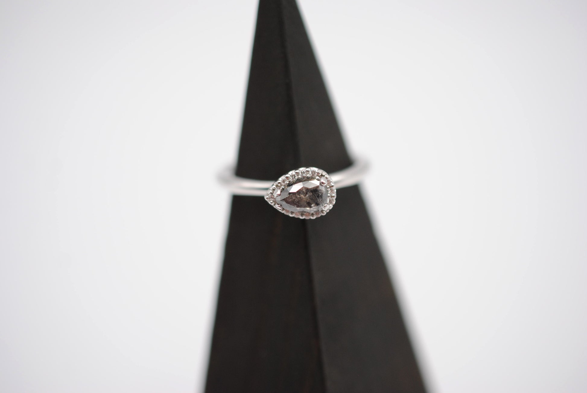 The ring features a natural black salt and pepper diamond. It's pear cut, 6mm x 4mm. The weight is .55 carats. The ring was ethically sourced.