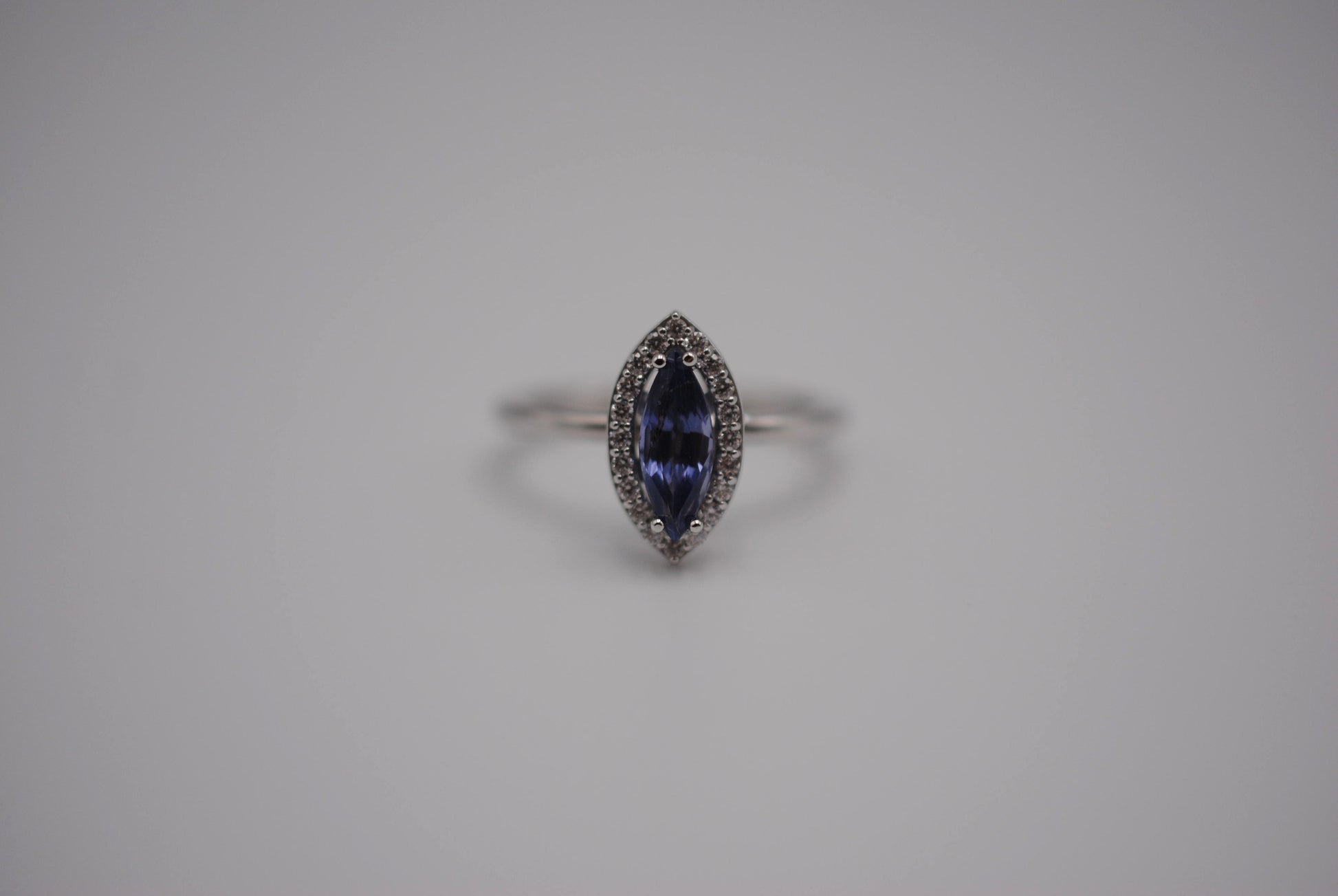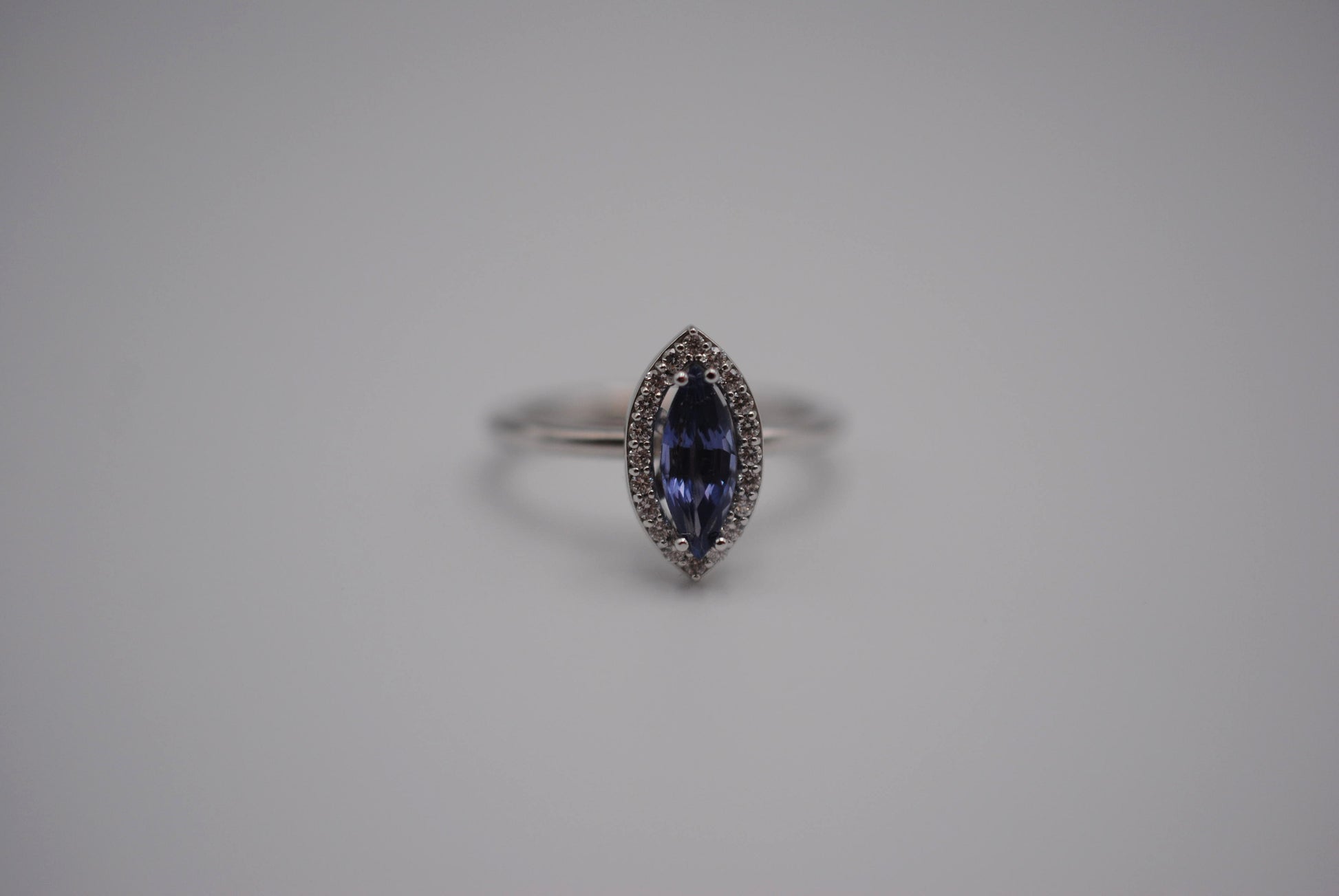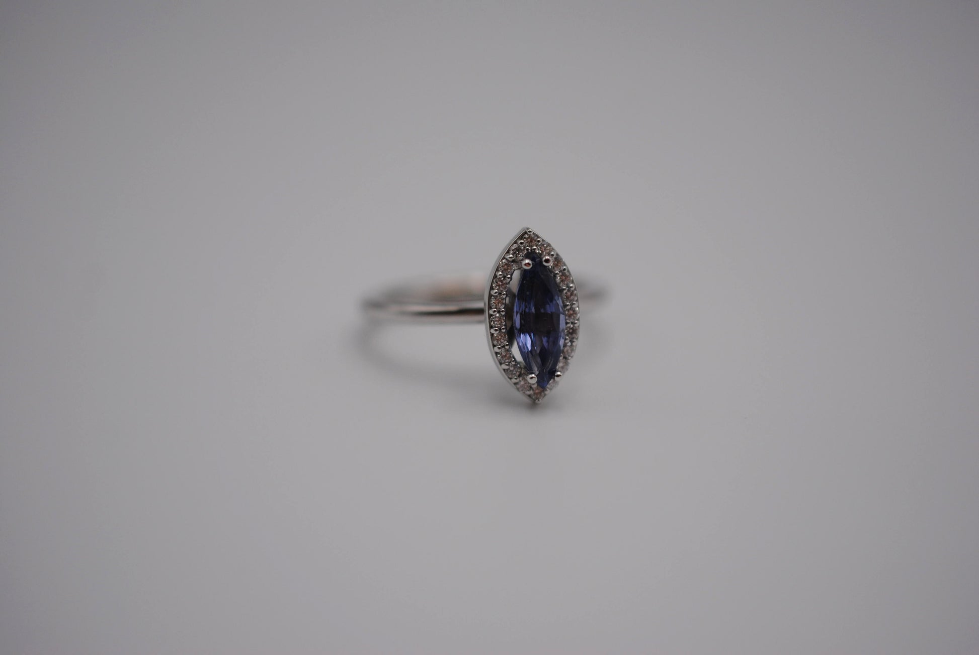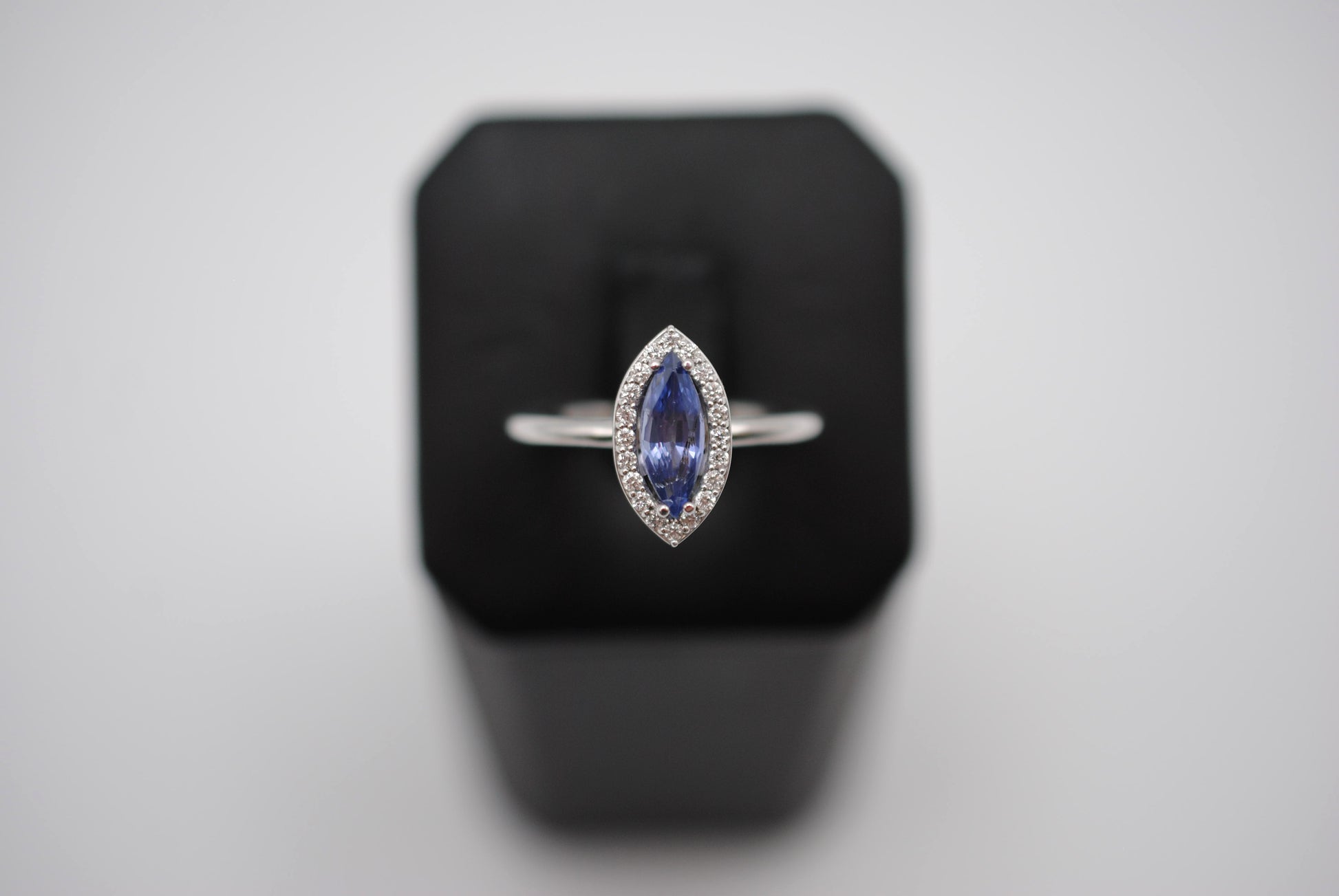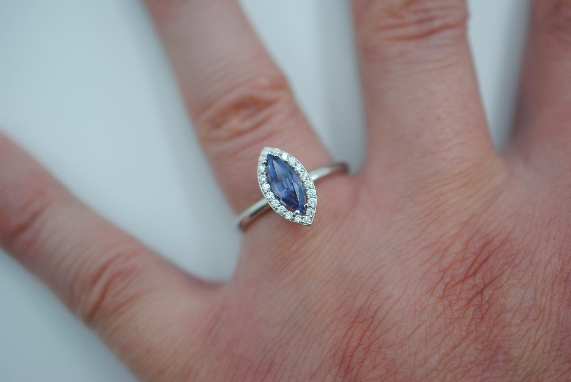 This is our Sapphire Ring: Marquise Cut, Diamond Halo, White Gold.