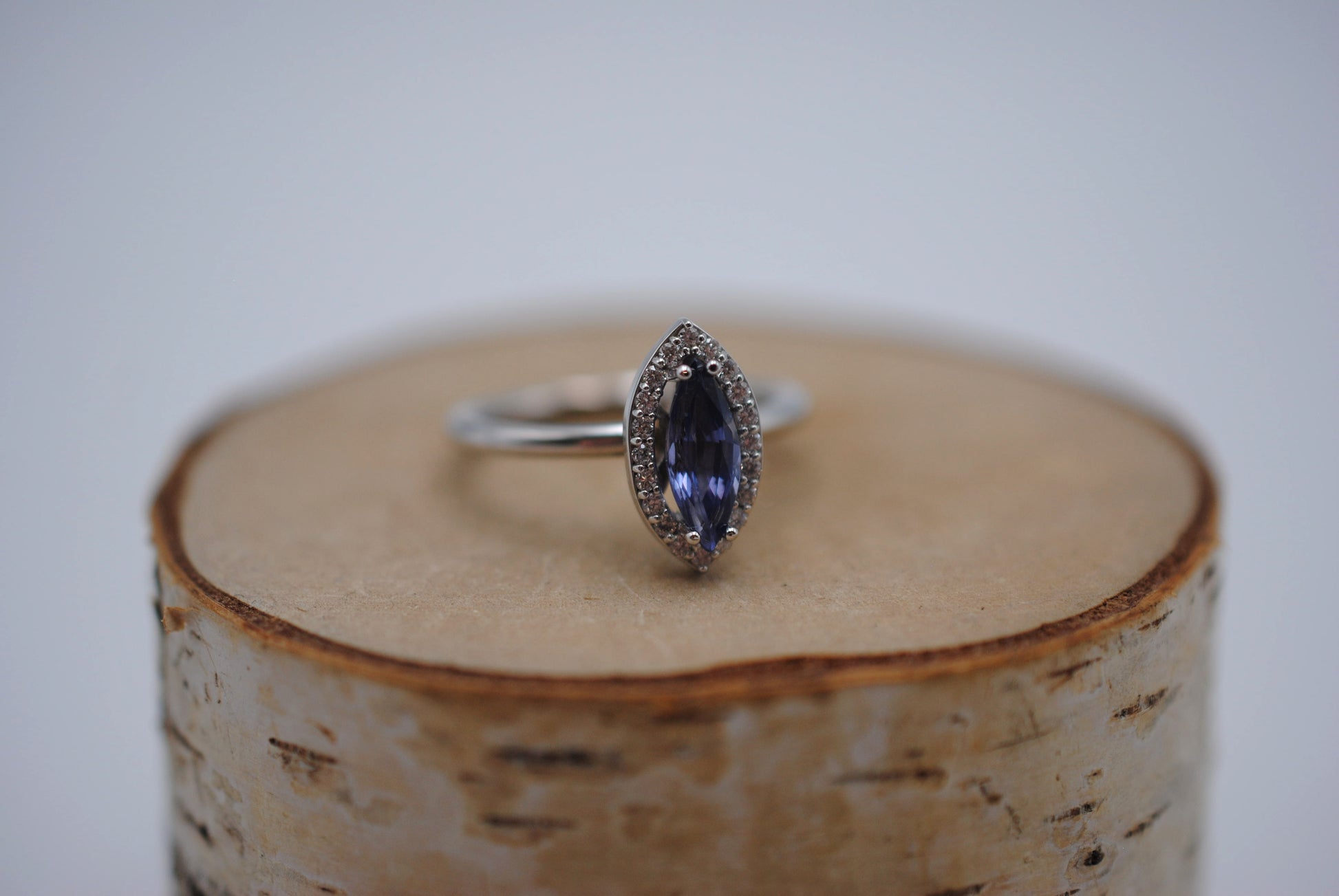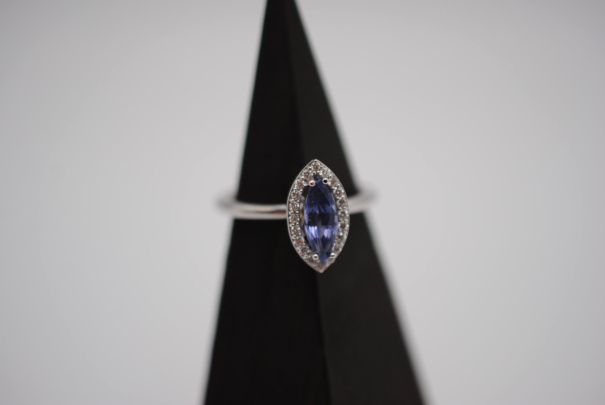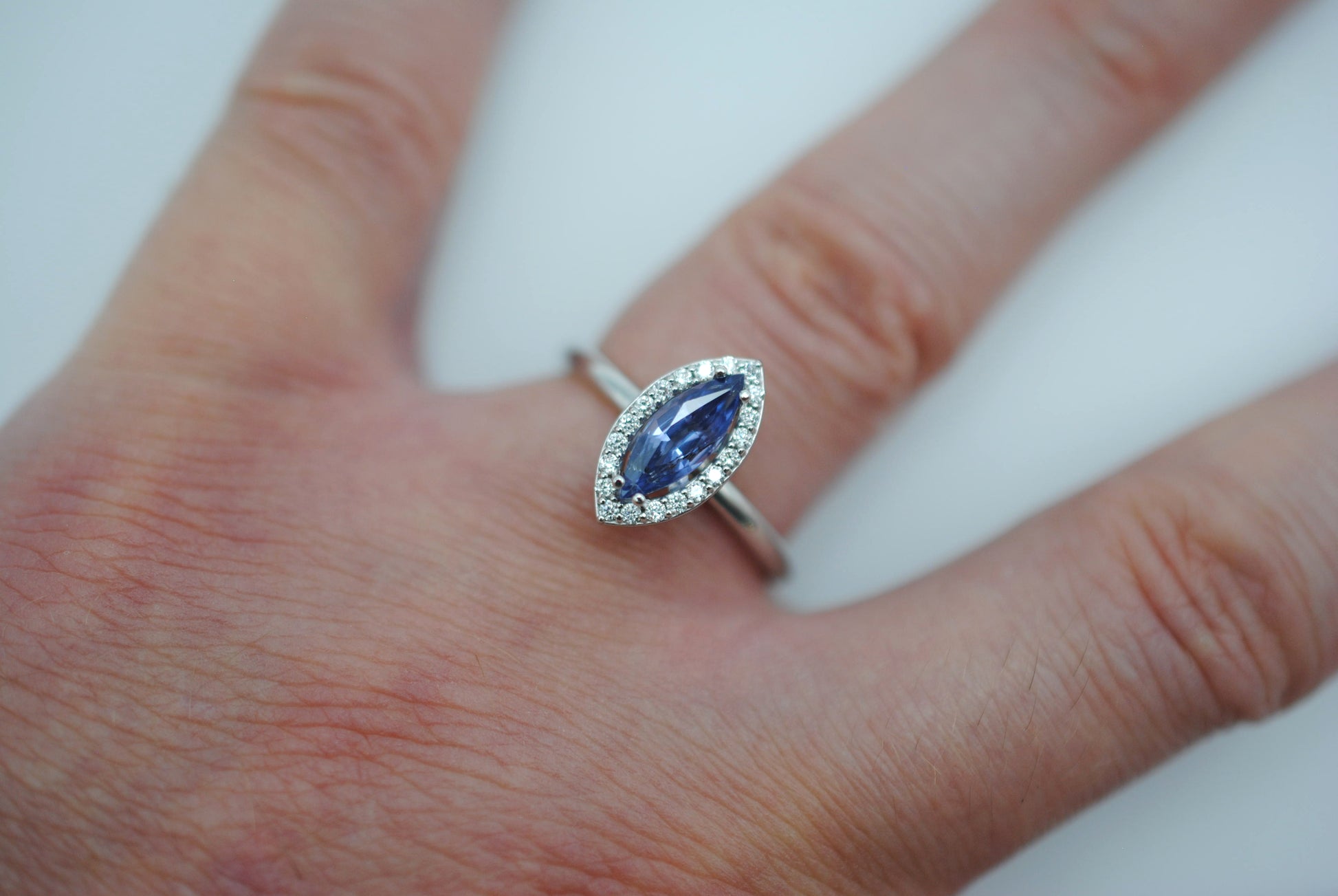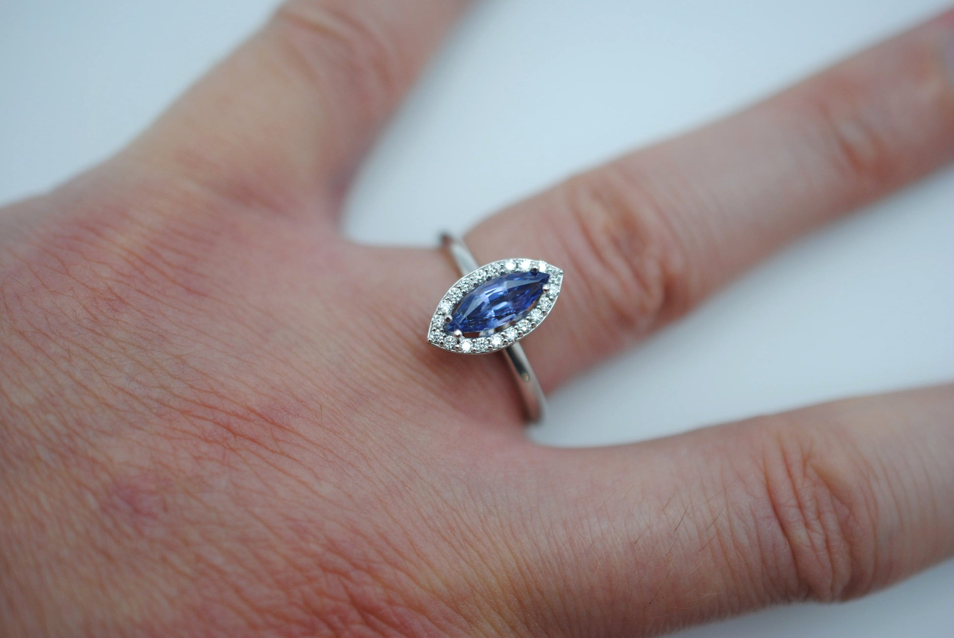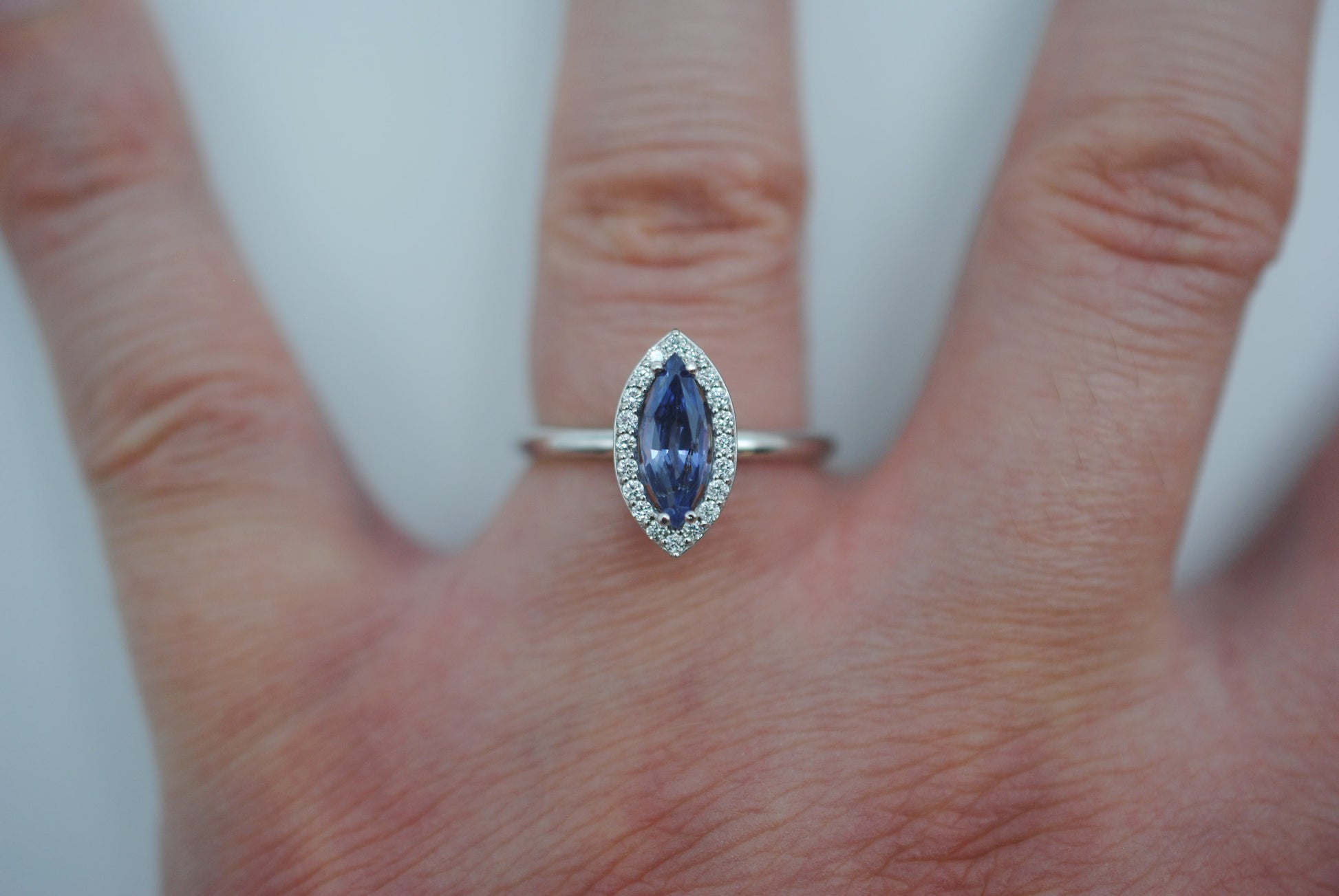 The ring features a marquise cut 11 x 4mm periwinkle sapphire. The weight is 1.15 carats. It's natural and ethically soured.