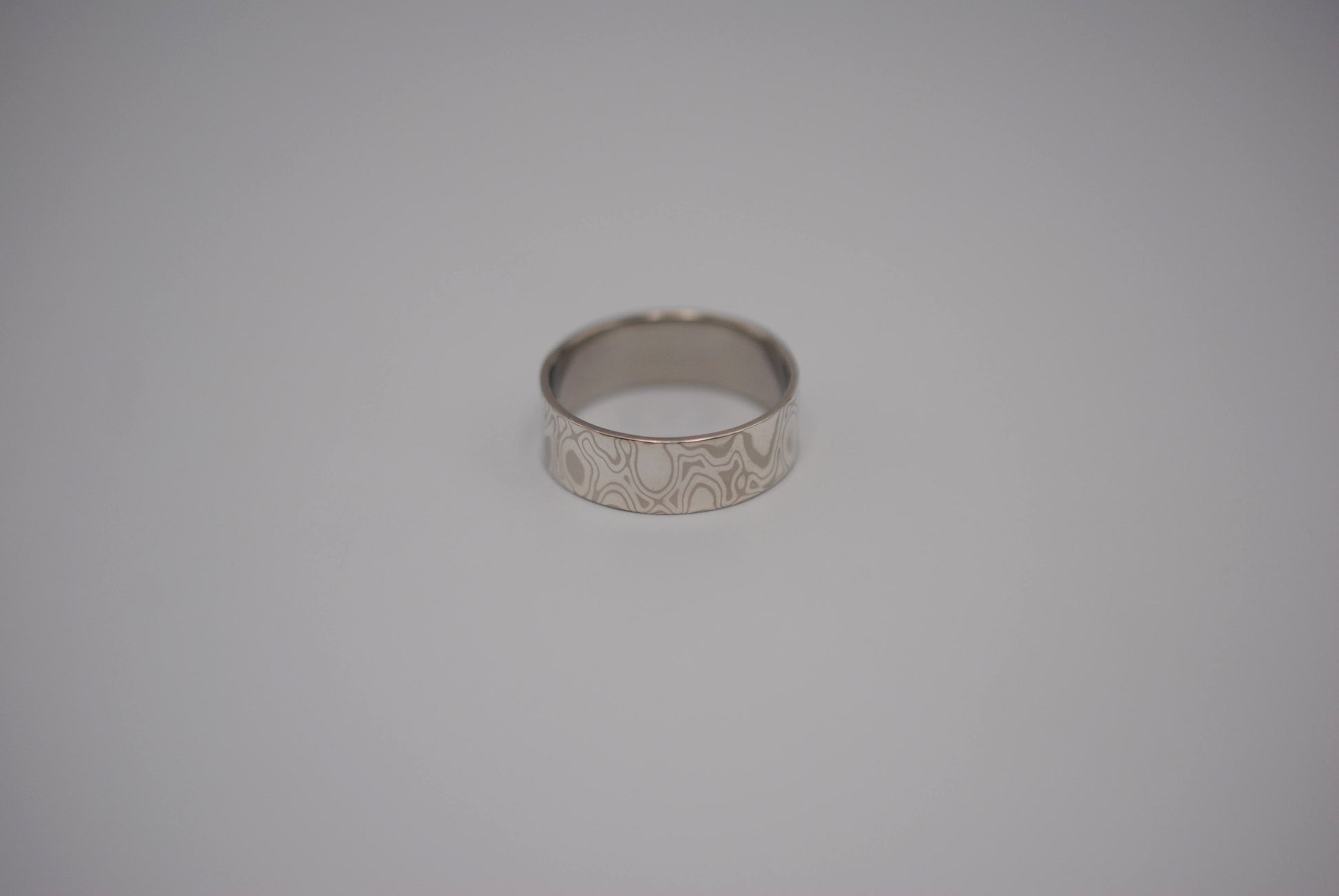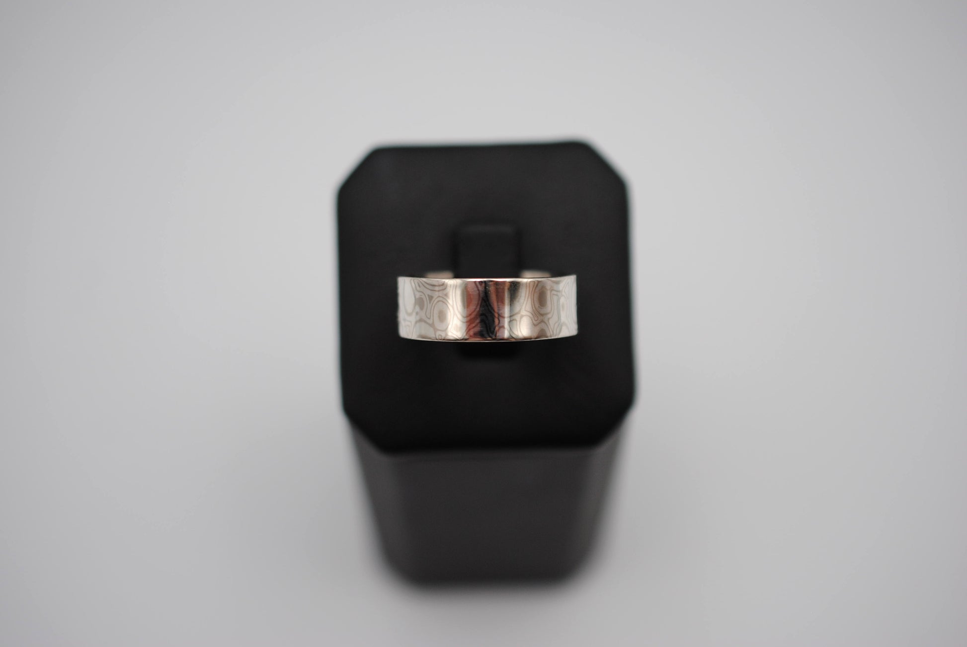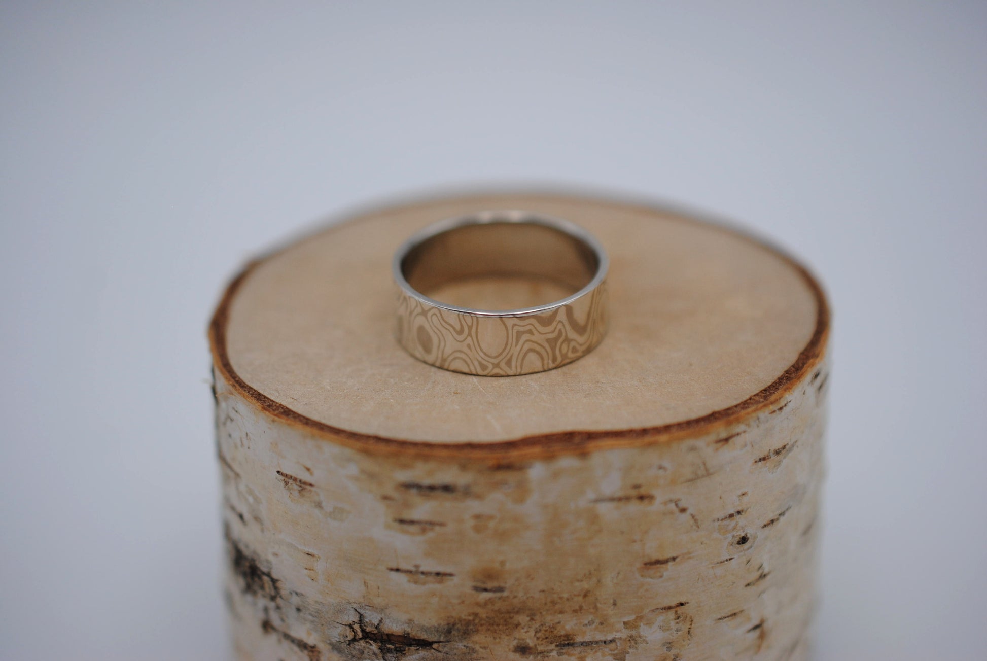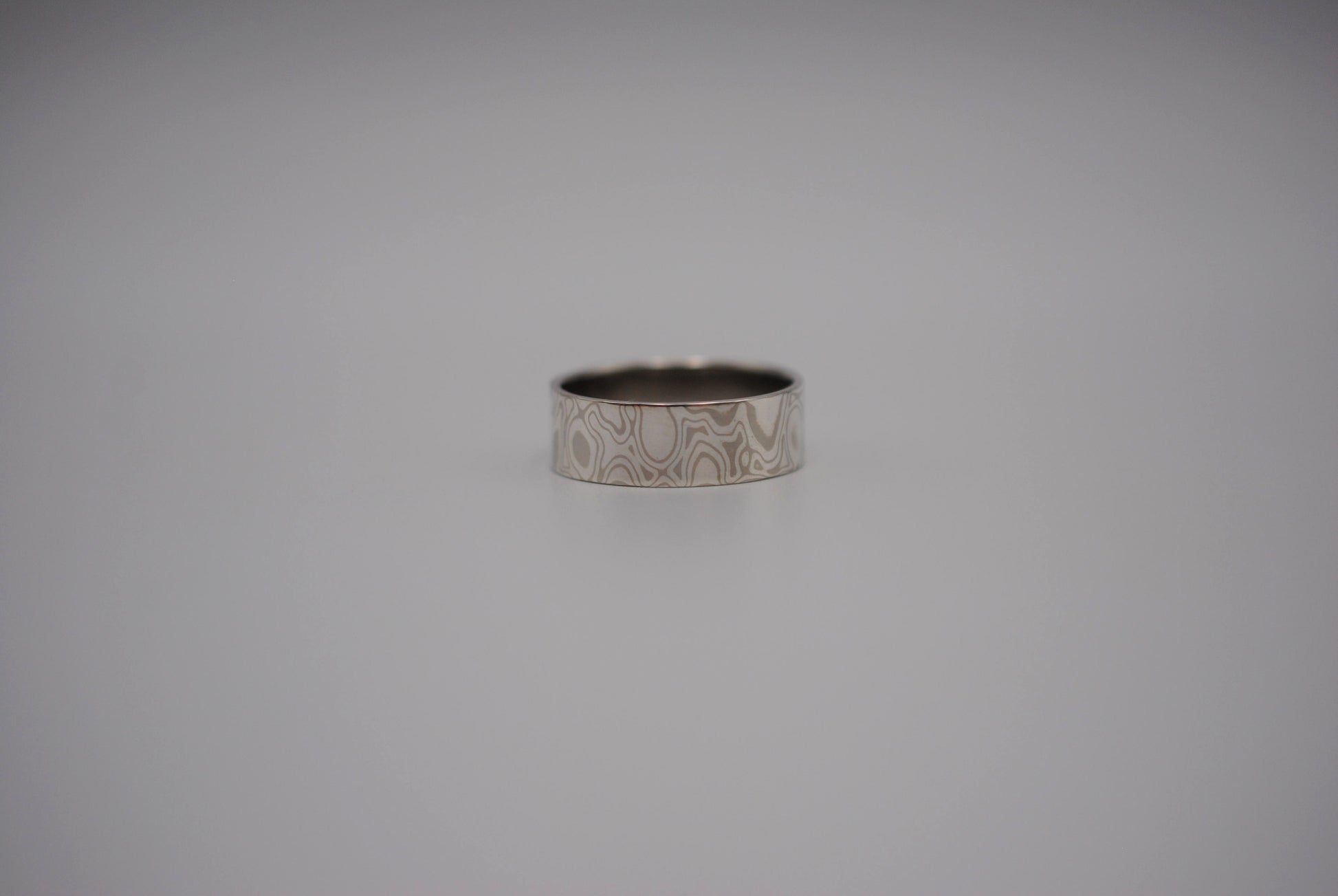 This is our Mokume Gane Ring Band: Palladium White Gold and Sterling Silver, 7mm Width.