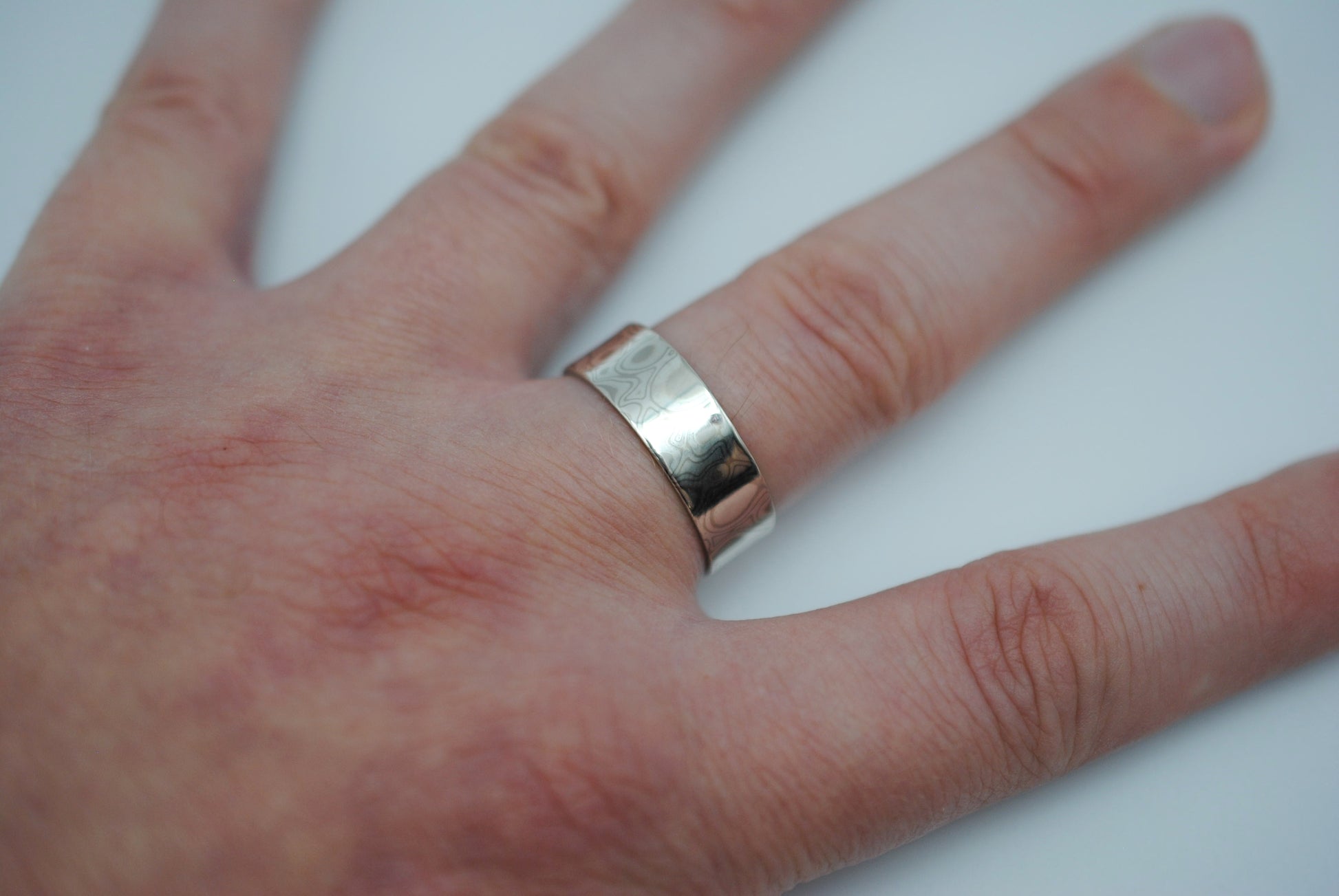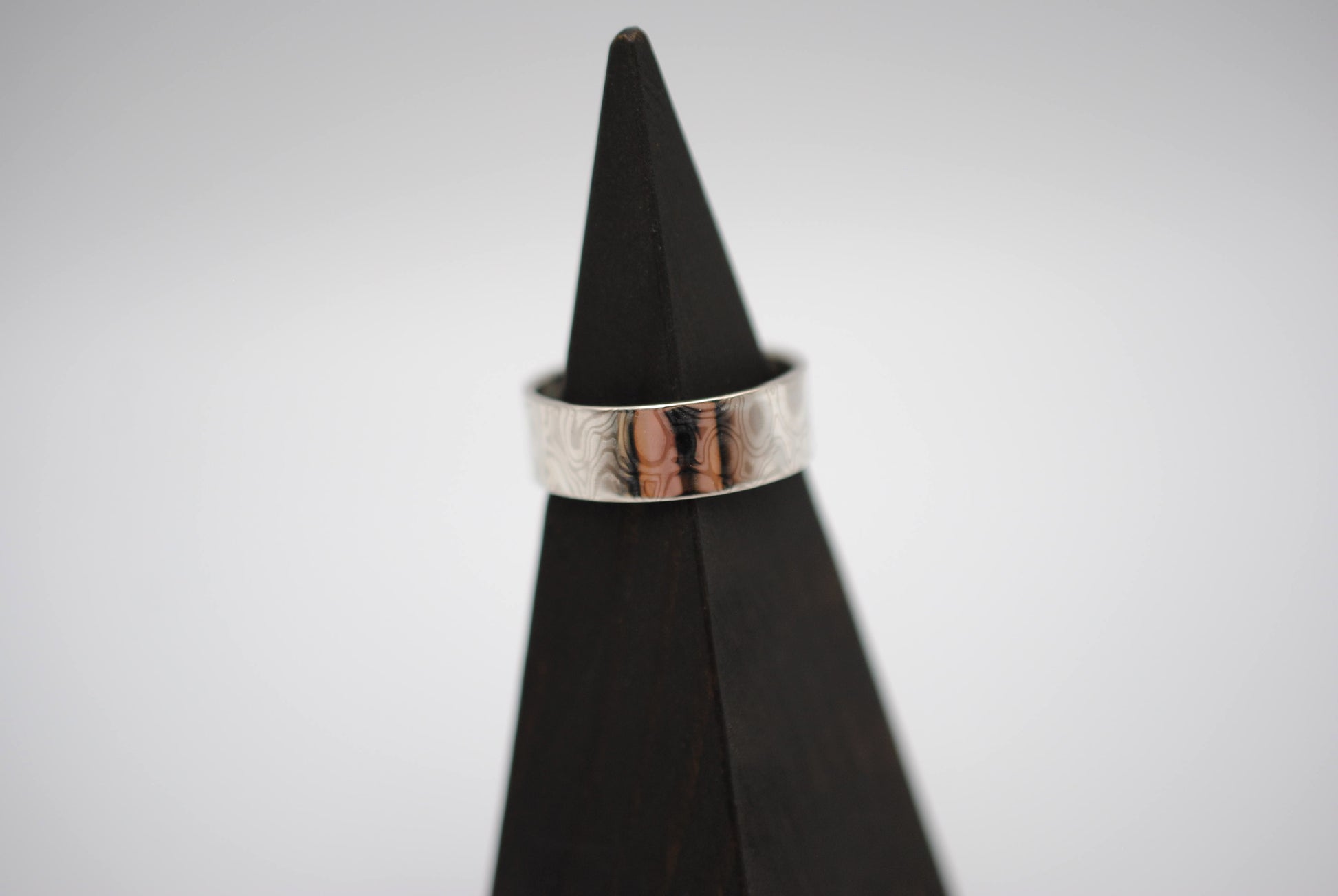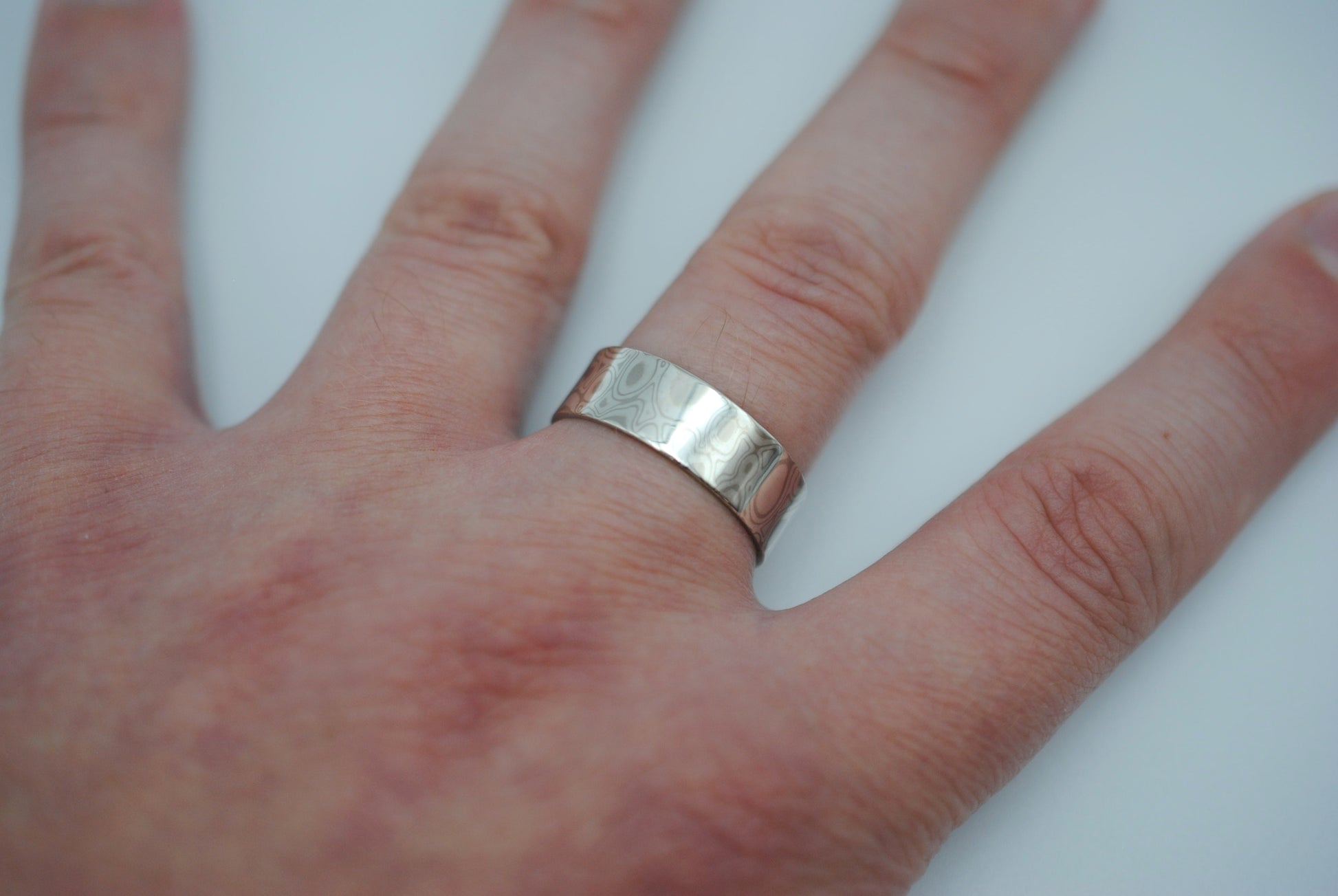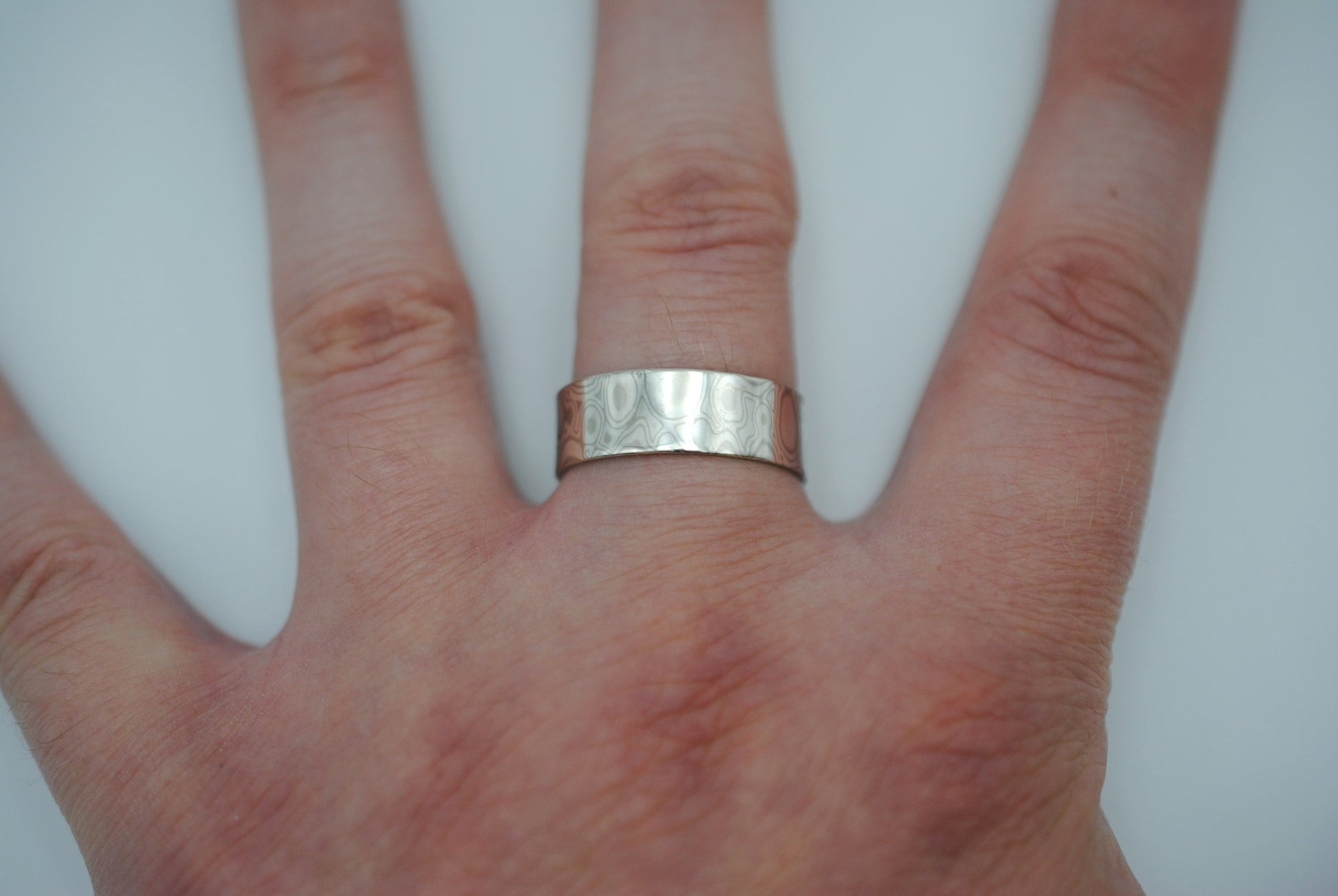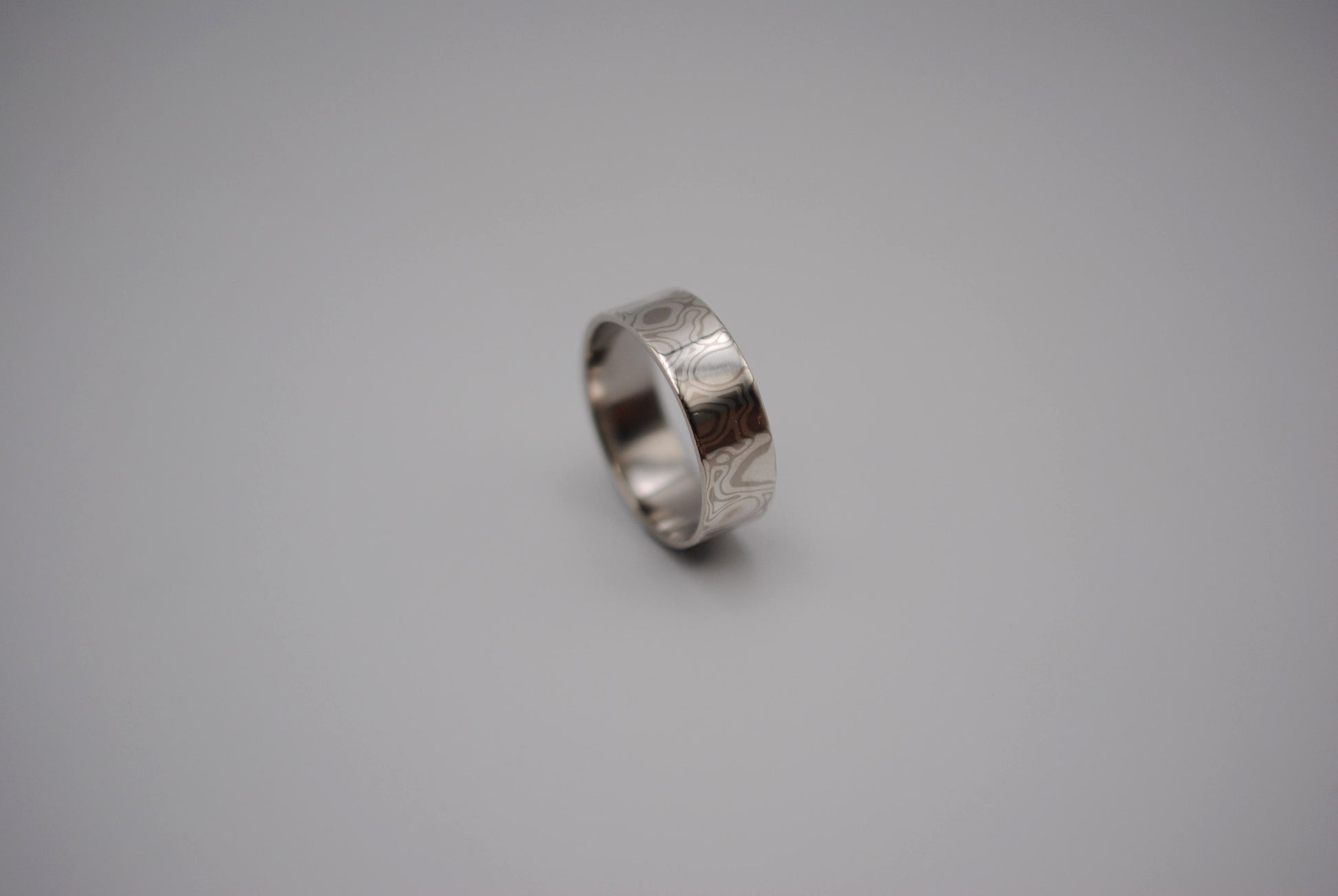 This is our Mokume Gane Ring Band: Palladium White Gold and Sterling Silver, 7mm Width.